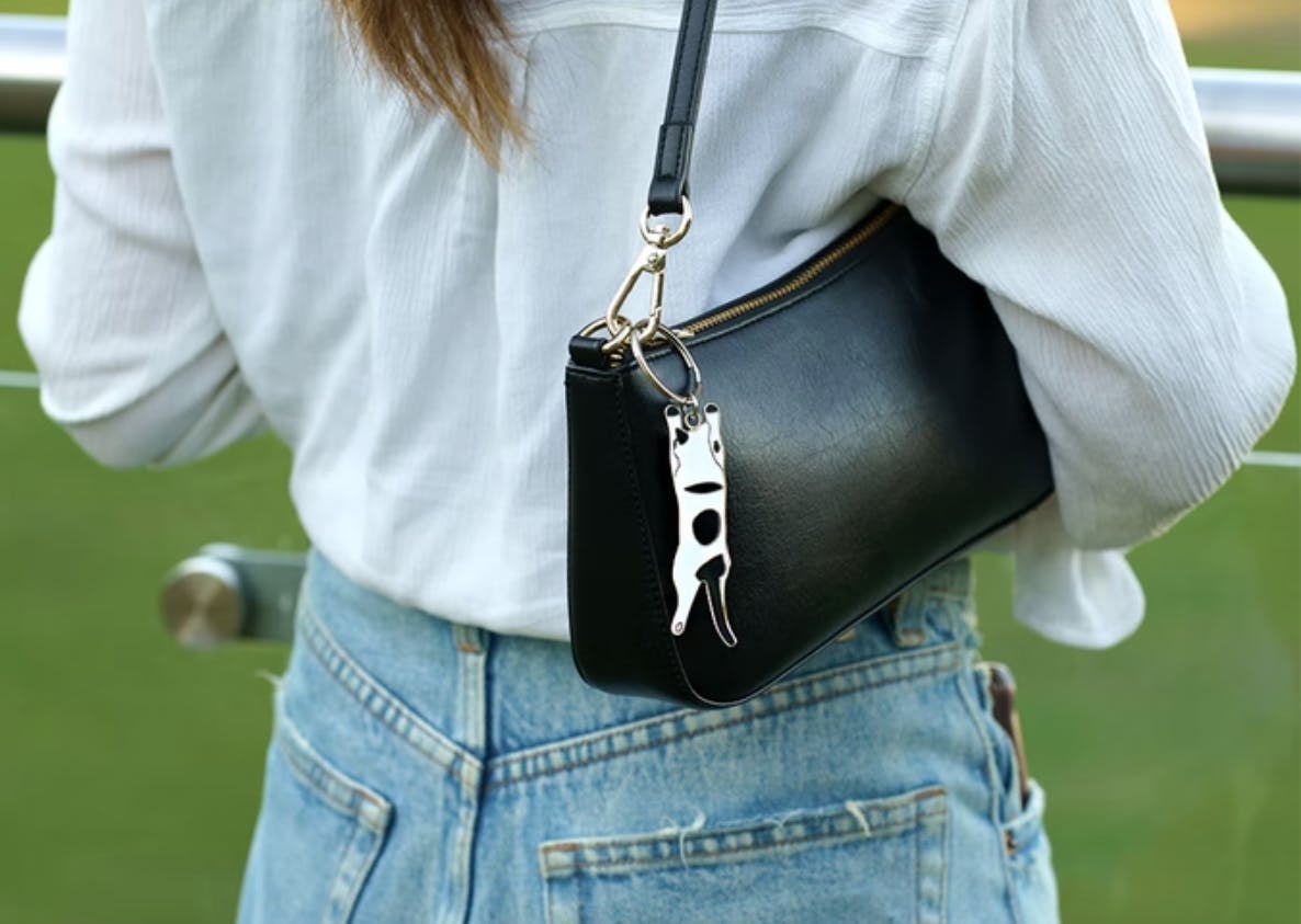 寝そべる姿でネコがバッグを持ち!使用しない時はバッグにぶら下がり「nyanger」です。