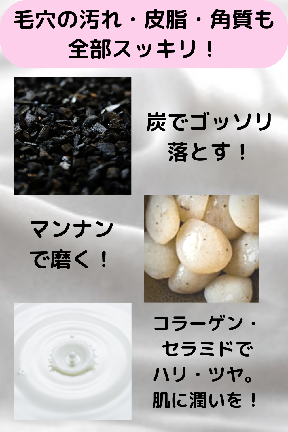 スクラブ成分として、泥、炭、グルコマンナンを使用しました。