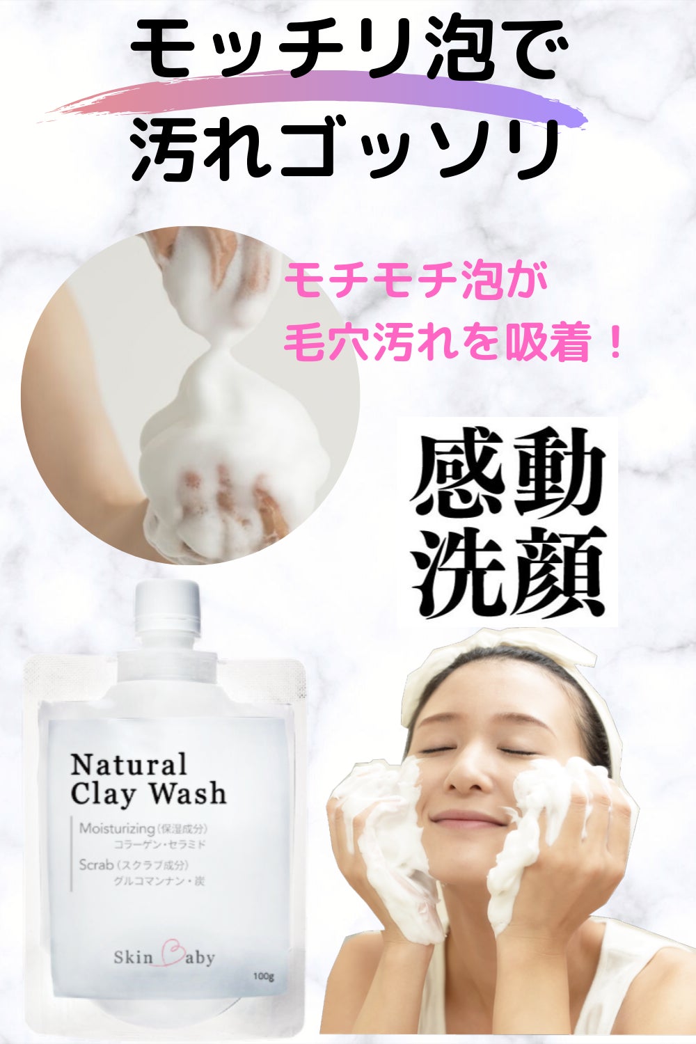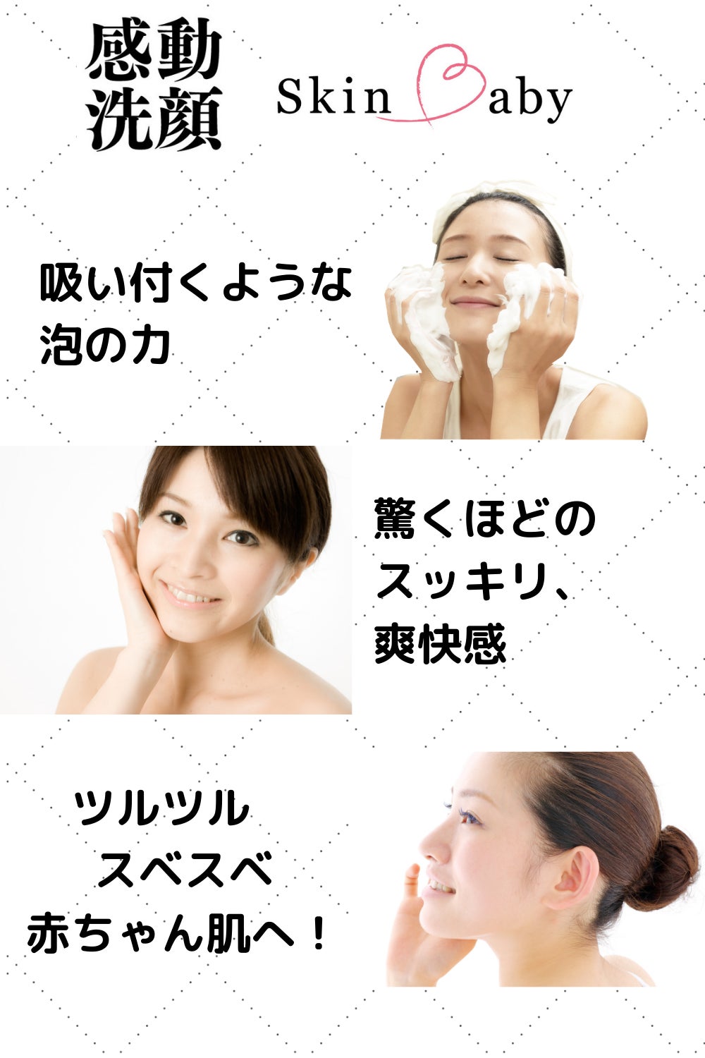 そんな肌の悩みを「なんとかしたい」「忙しい人でも、簡単に毎日、続けられる美容法は?」と真剣に考えました。実はそんな思いから、「感動洗顔 SkinBaby」の開発をしました。