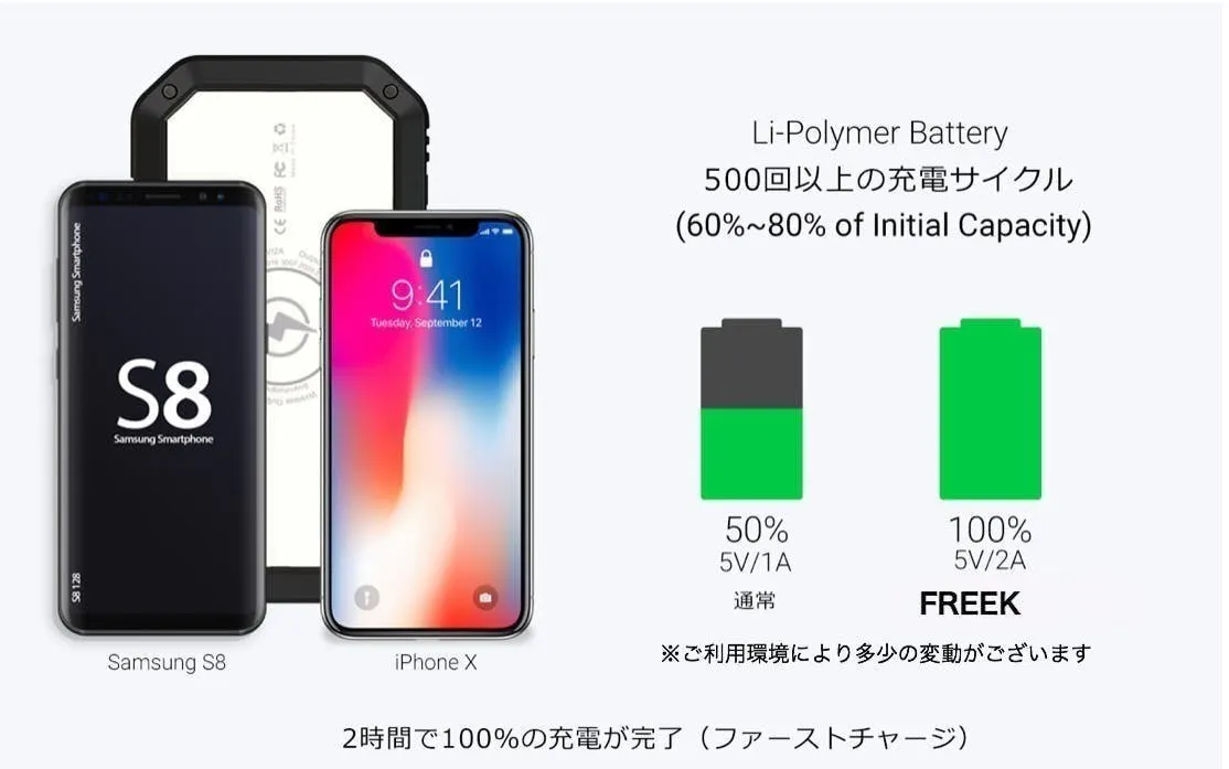 高密度リチウムポリマーバッテリーの技術によって小さなサイズの中に大容量のバッテリーを搭載しています。コンパクトな設計が採用されたFREEKは、持ち運びが便利です。手のひらサイズに全ての機能が搭載されています。