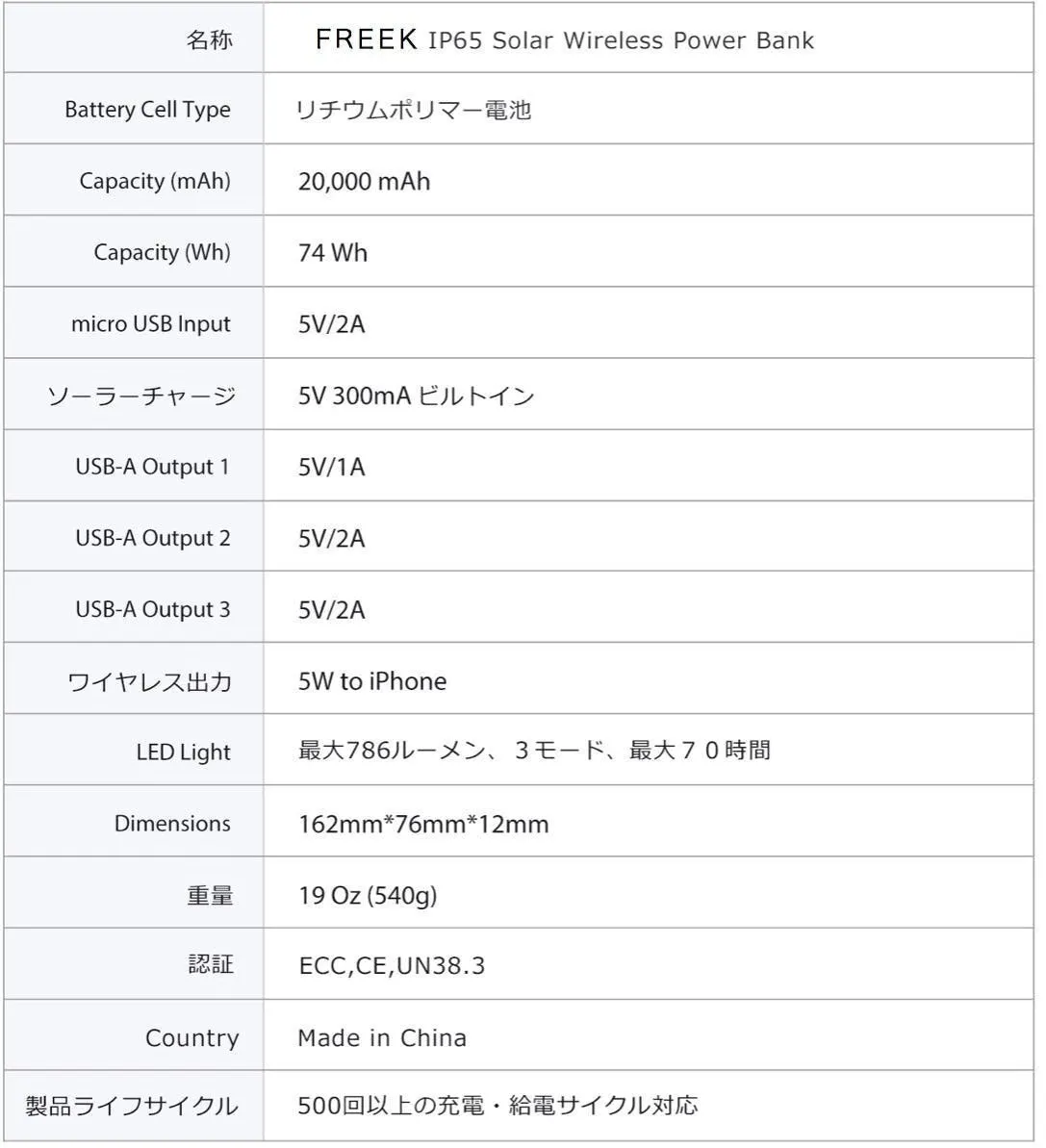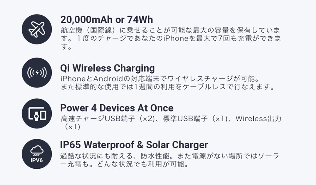 大容量20,000mAhが魅力です。また寿命も長く安全装置も備わっています。日本だけでなく、様々な国際基準を満たしています。