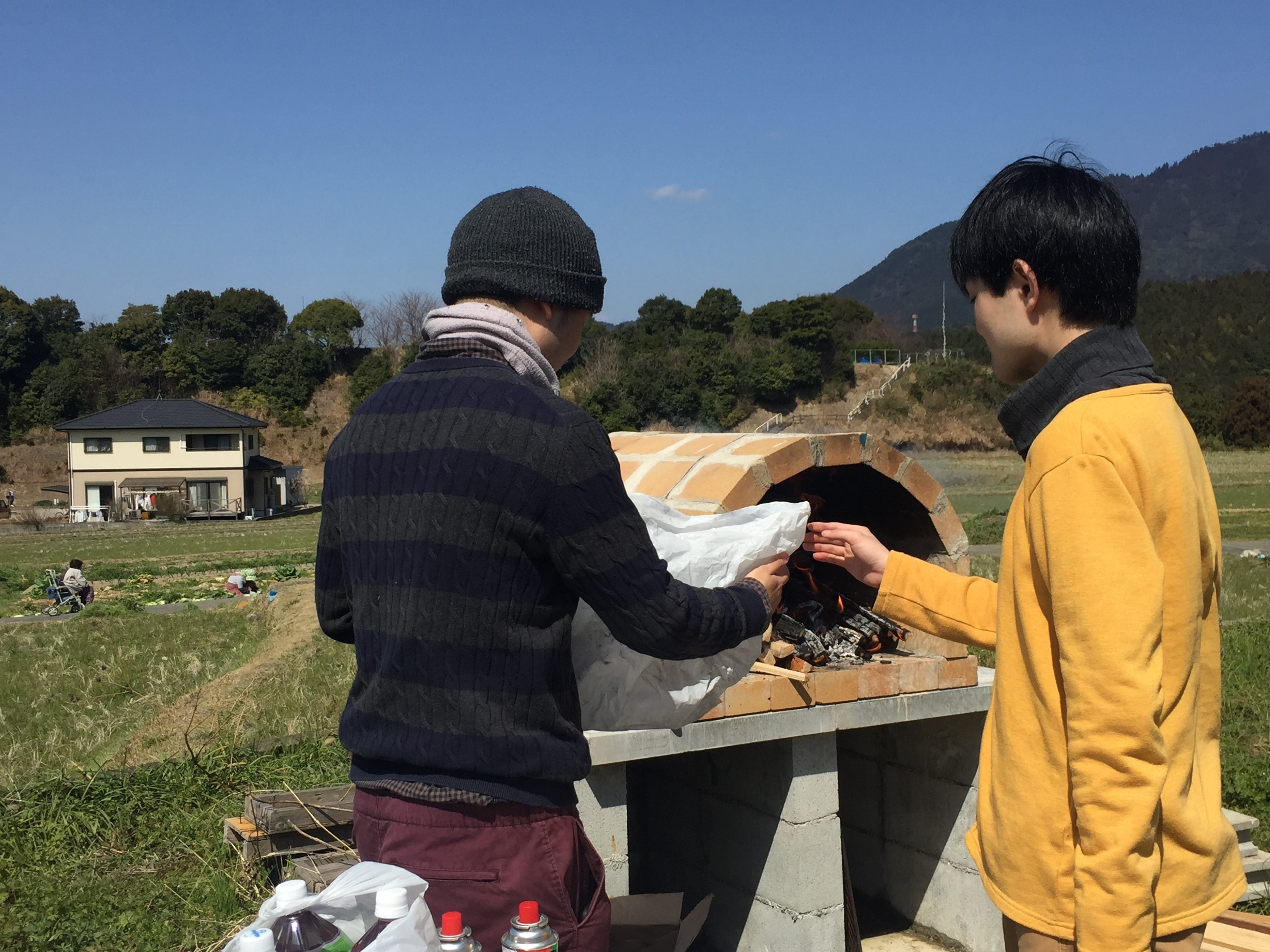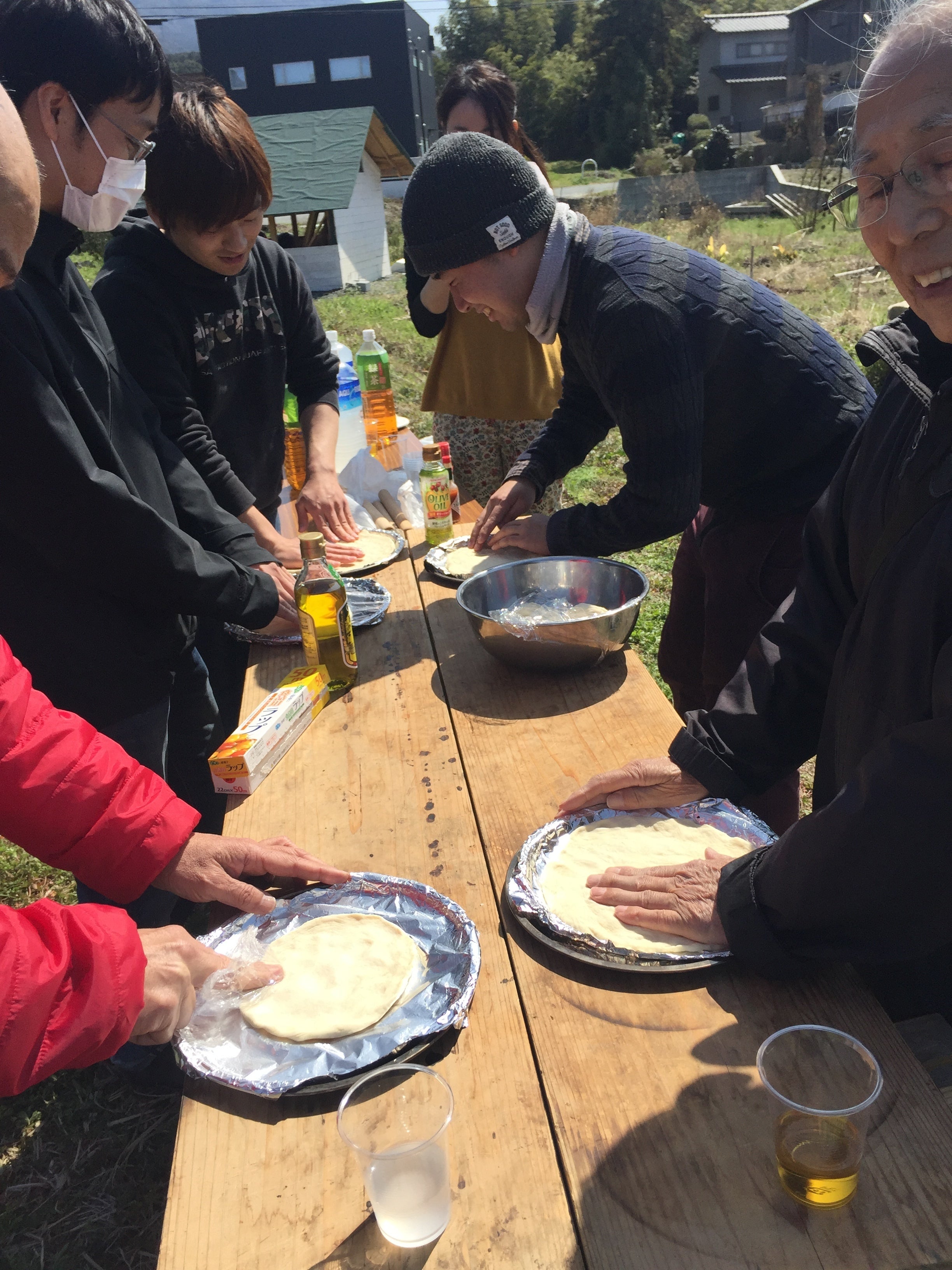 春の足音が聞こえてくると、NPO法人緑のキャラバン隊に誘われて、宇美町障子岳の大きな青空のもとピザパーティを行いました。トマトやピーマン等のトッピング材を切りその横で生地をこね発酵するのを待ちます。ピザ窯に火が入れば、あとは伸ばした生地にトッピング材をのせて焼くだけです。