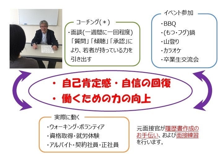 彼らが働けないのは「働く場所がない」といった単純な理由ではなく、「働く勇気が足りない」といった心の問題なのです。勇気を持って前に進むためには、自己肯定感・自信を回復し、働くための力を向上することが必要なのです。そのために、彼らにはイベント参加、実際に動く、コーチングを通して、力を付けてもらいます。