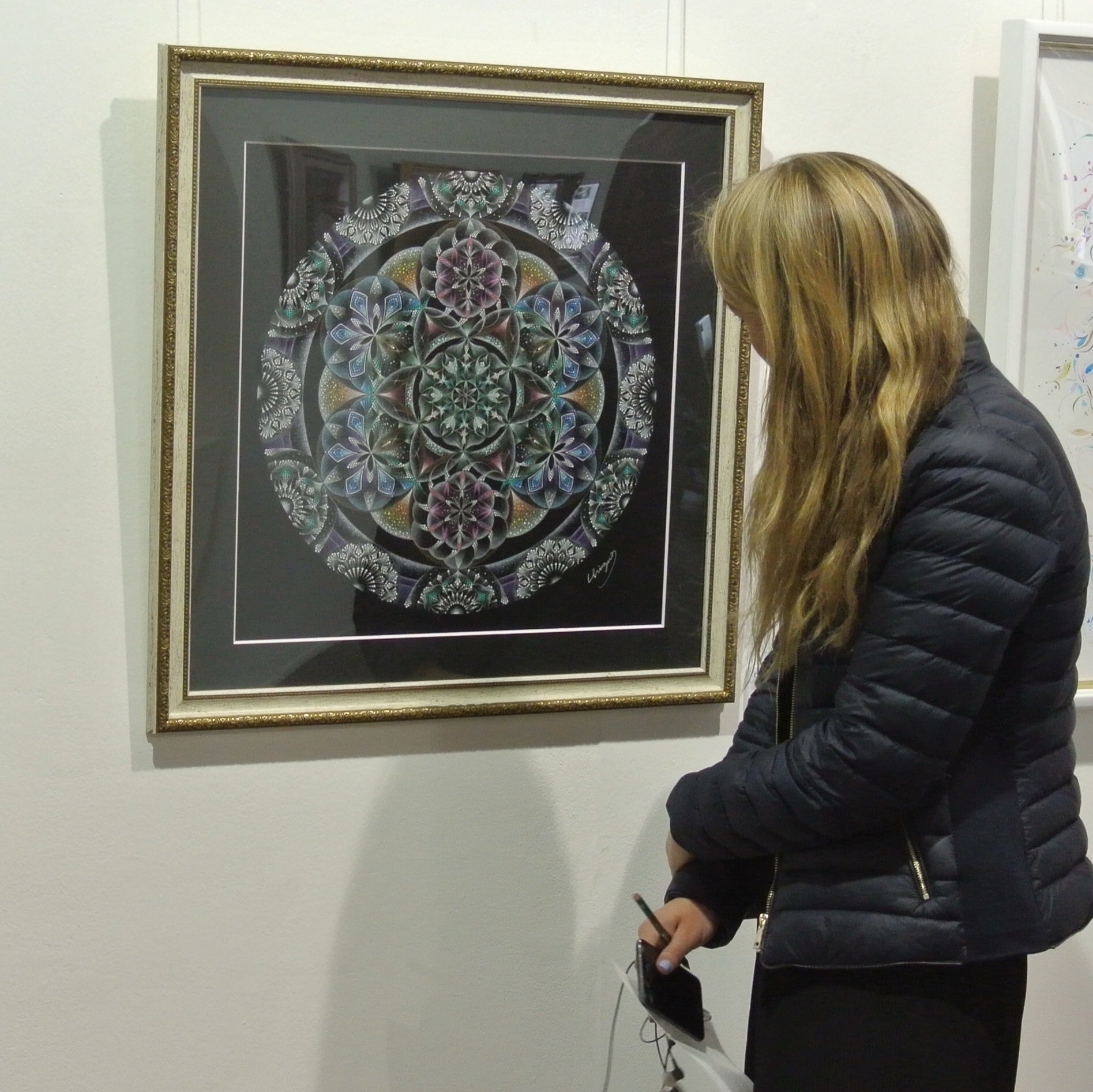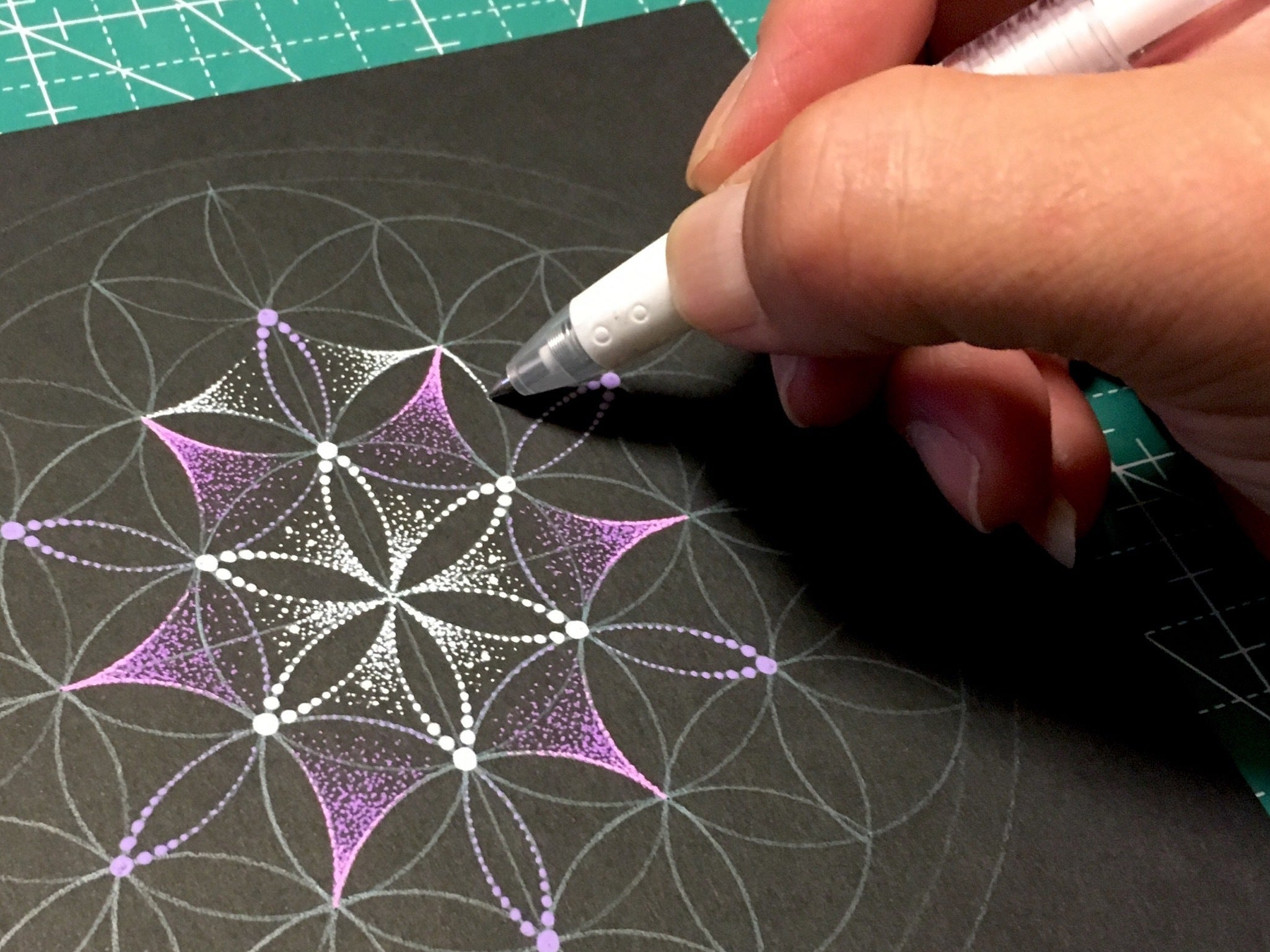 コンパスや定規を使って描いた幾何学模様の下絵に、ゲルインクのボールペンを使って点描で描くアートです。