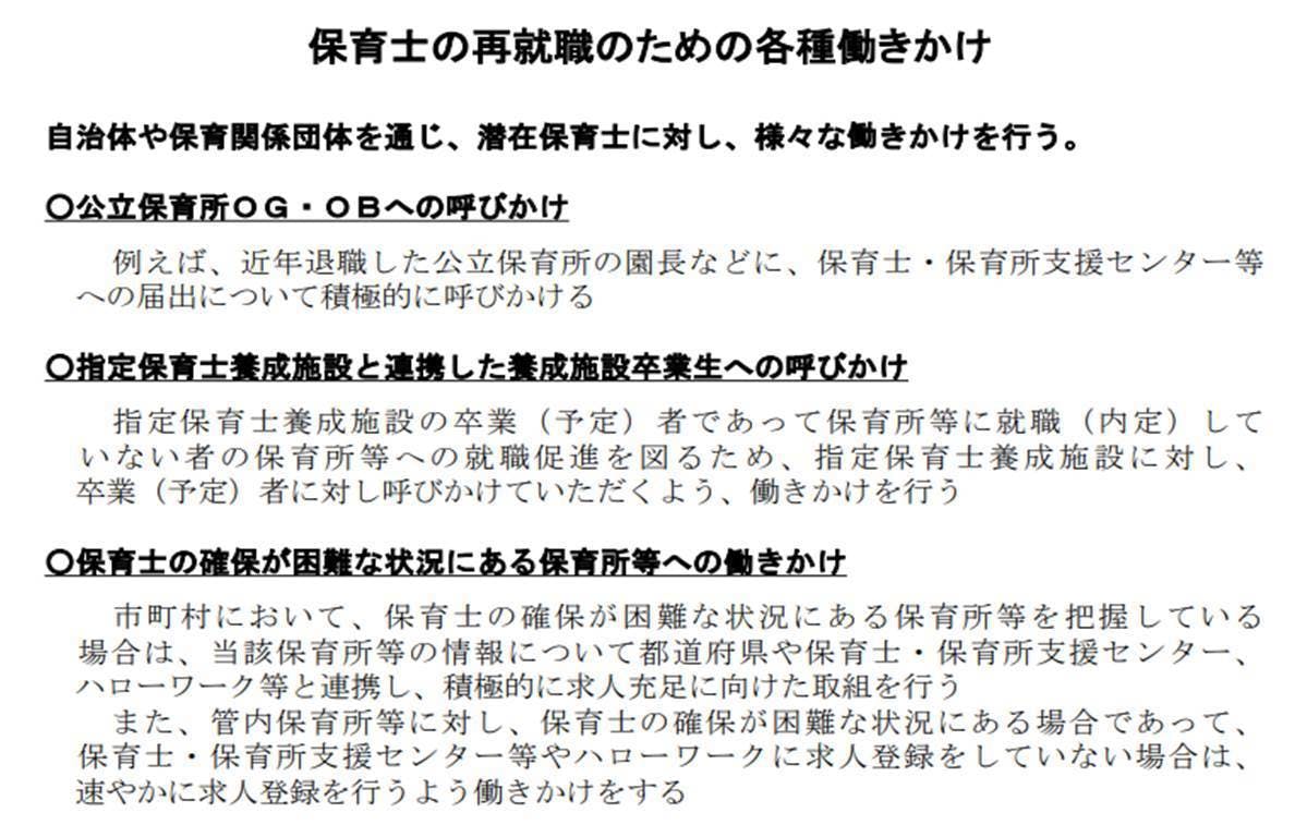また同じく厚生労働省では保育士の再就職支援のプランも掲げておりますが、具体策を掲げるには至っていないと考えています。(出典:厚生労働省HP https://www.mhlw.go.jp/file/05-Shingikai-11901000-Koyoukintoujidoukateikyoku-Soumuka/3_2.pdf)