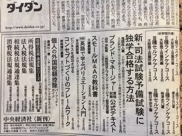 昨日(9月12日)の日経新聞朝刊の1面に中央経済社の新刊ということで広告を載せて頂きました。ありがたいことです。自分でももう少しPRしなければなりませんね。
