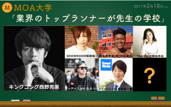 なんと、あのキングコング西野亮廣さんにもMOA大学の先生になっていただきます。西野亮廣さんはお笑い芸人でありながら絵本作家としても活動し、周囲に批判されながらも、道無き道をたった一人で開拓してこられた方です。僕達は西野さんのような、今の時代と戦い先頭を走っているトップランナーの方々に登壇していただく学校にし、これからの時代において、本当に必要な事を学べる場を提供します。