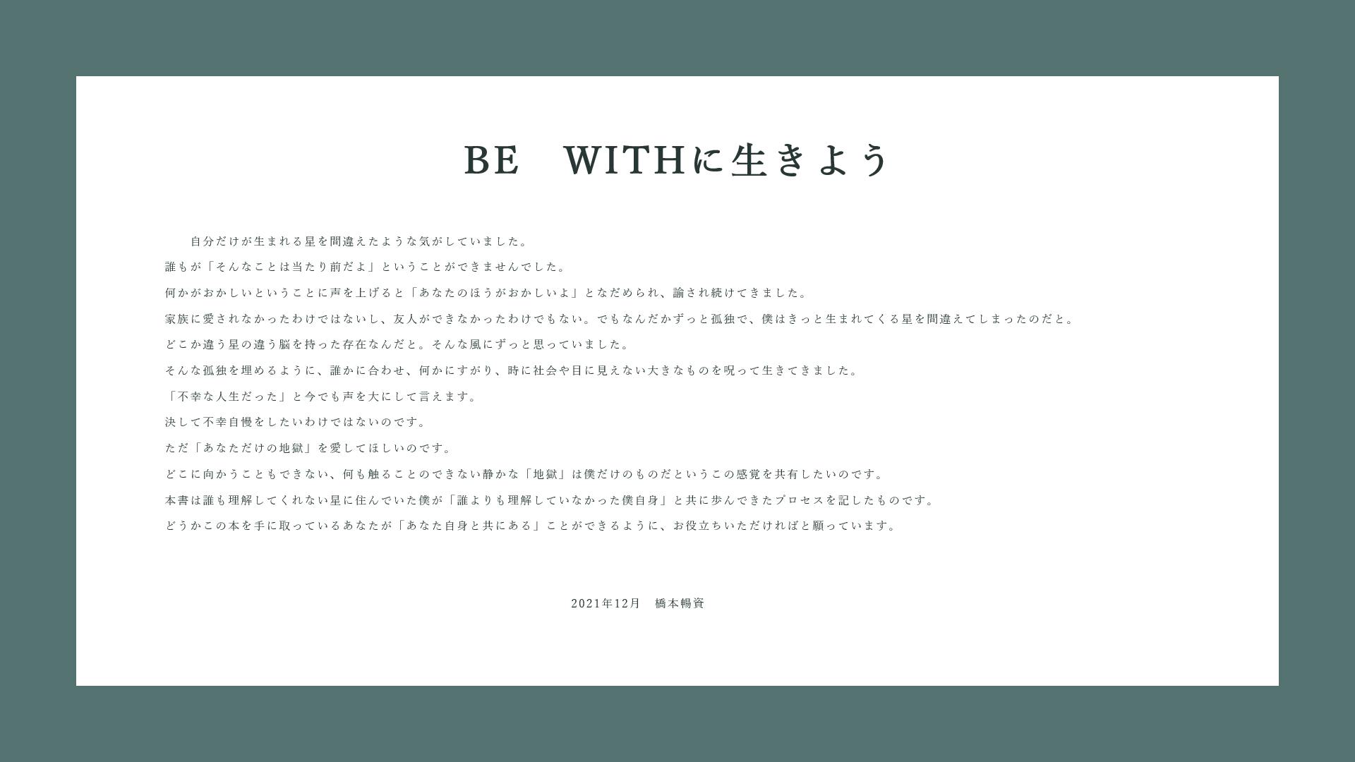 そんな「BE WITH」には「あなた自身があなたと共にいてください」という願いを込めています。