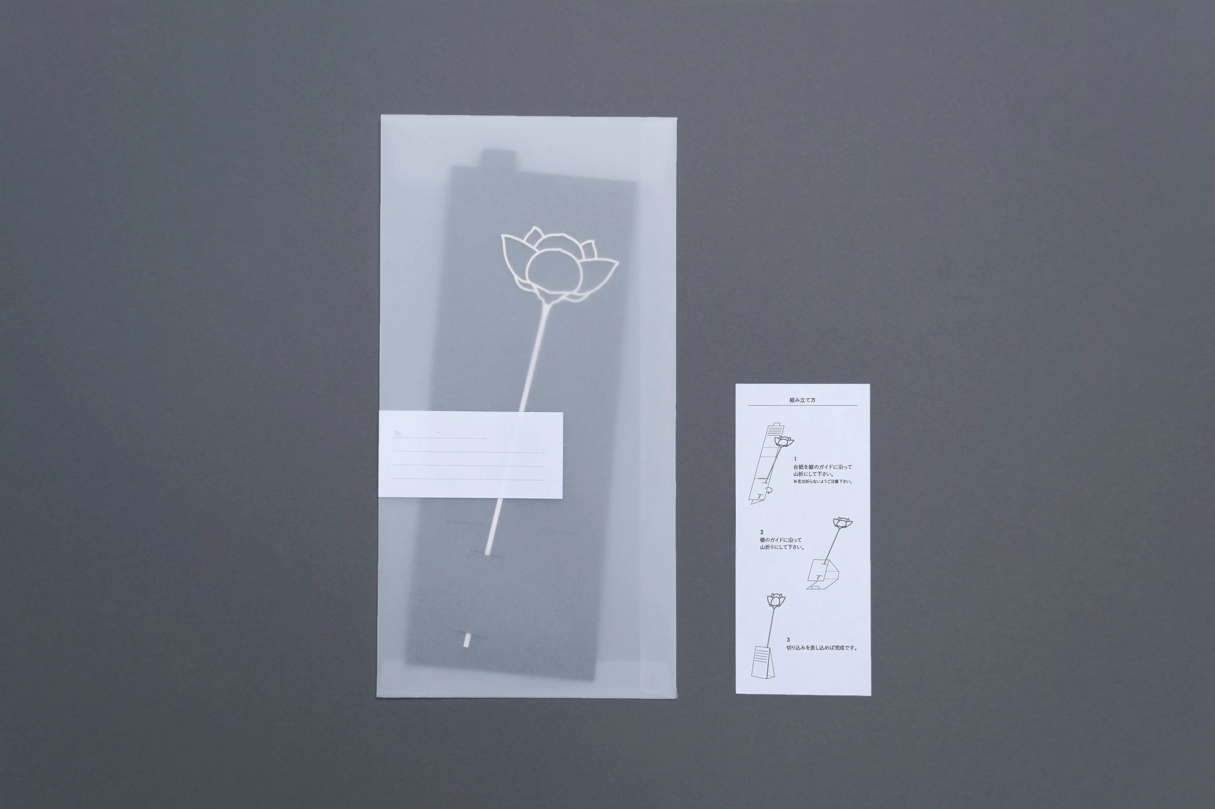 ②セットの封筒に送り先・送り元を記入し、組み立て方の用紙(※)と共に入れて封をします。