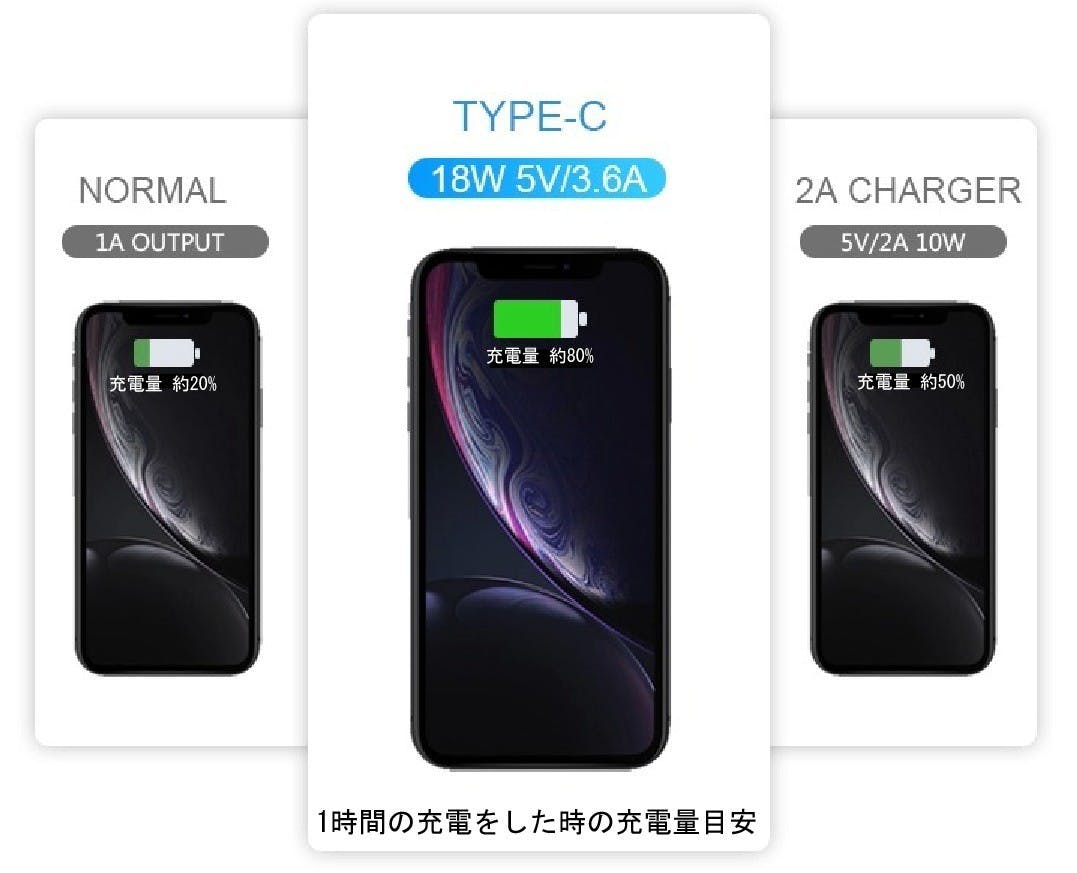 TYPE-Cにて高速充電した場合、約1時間で80%の充電を可能としています。