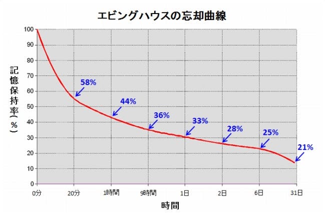 下の表は、覚えたはずのキーワードがどれだけ記憶されているか、時系列で表したものです。
