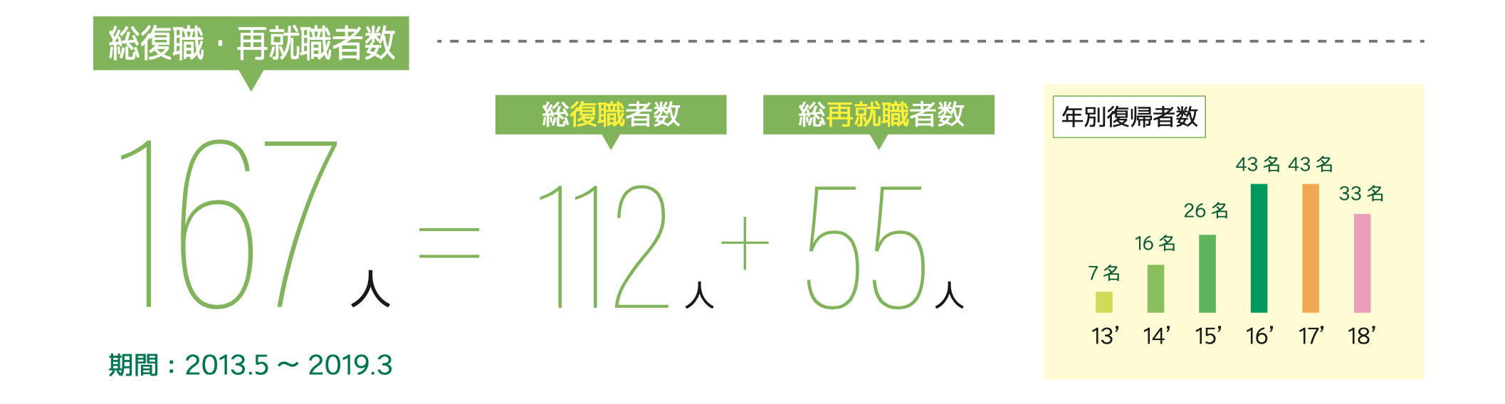 リワーク事業は、うつ病により仕事をお休みされている方を対象に各種心理プログラムと専門職によるカウンセリングにより、体力の回復と自己課題への認知変容を目指す支援事業です。スムーズな復職を支援し、再発防止のための定着支援を実施しています。