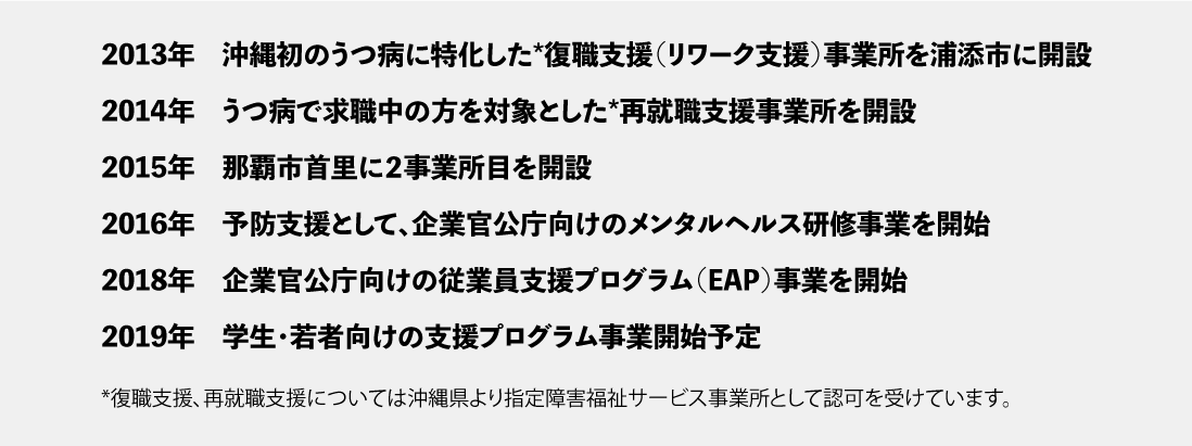 私たち株式会社BowLは沖縄でうつ病の方の社会復帰支援を手掛けるリワーク支援事業として、2013年に創業しました。