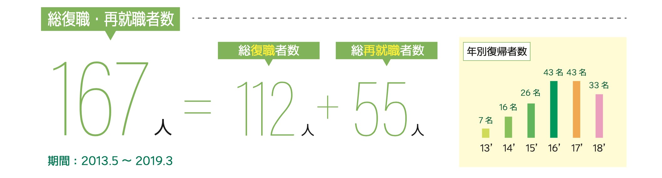 うつ病等のメンタルヘルス不調で休職すると、心療内科で処方される薬を服用し、自宅療養が必要となります。たいていはこれだけで抑うつ状態を改善されますが、長らく仕事を休んでいたため体力が低下している状態です。またうつ病に至る要因(心理指向性や行動特性など)が改善されていないため、復職できたとしてもストレスがかかる度にメンタルヘルスに不調をきたし、再休職に至ってしまいます。リワーク支援はその課題にアプローチする職業リハビリテーションとして近年注目されている支援です。