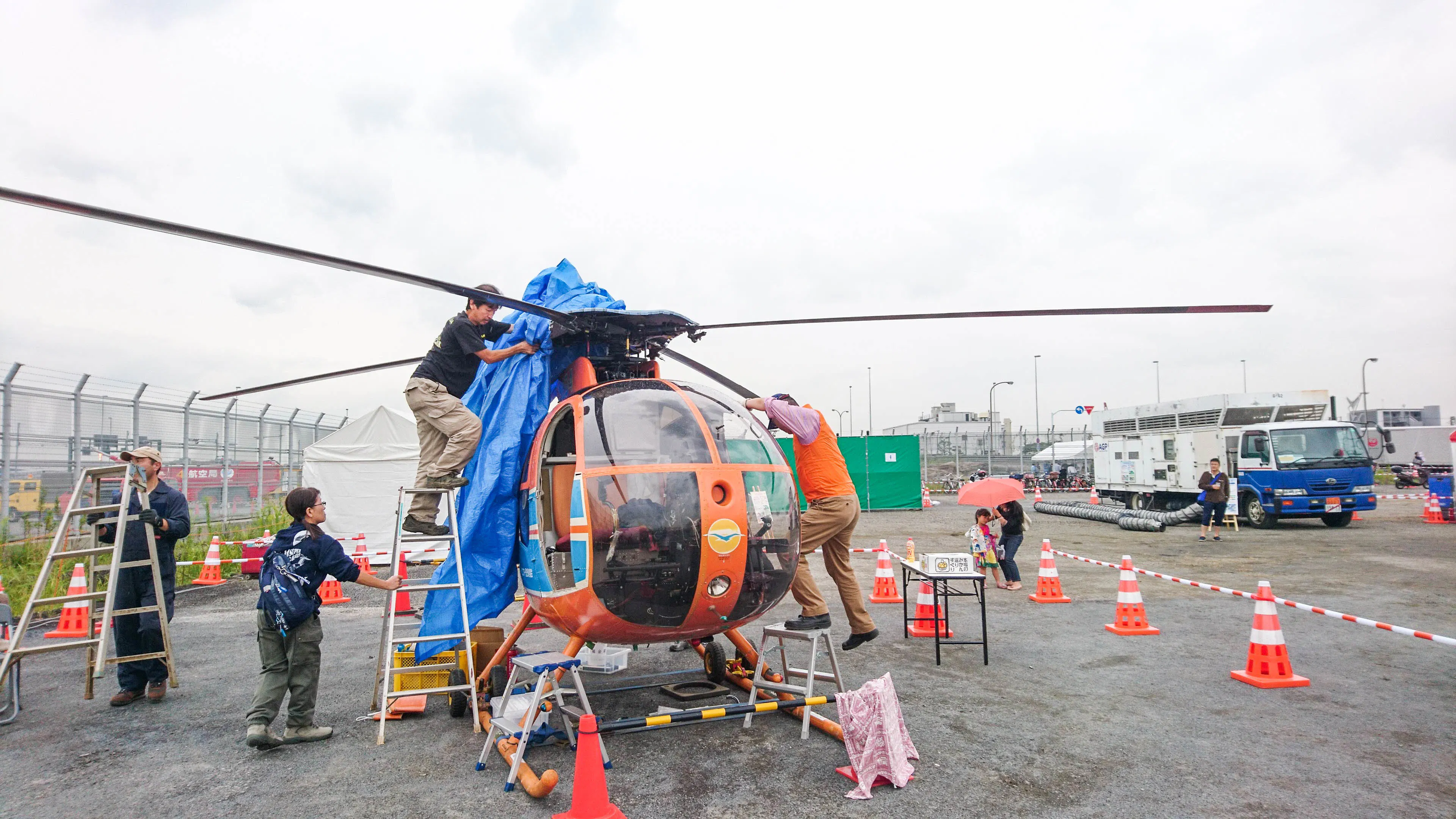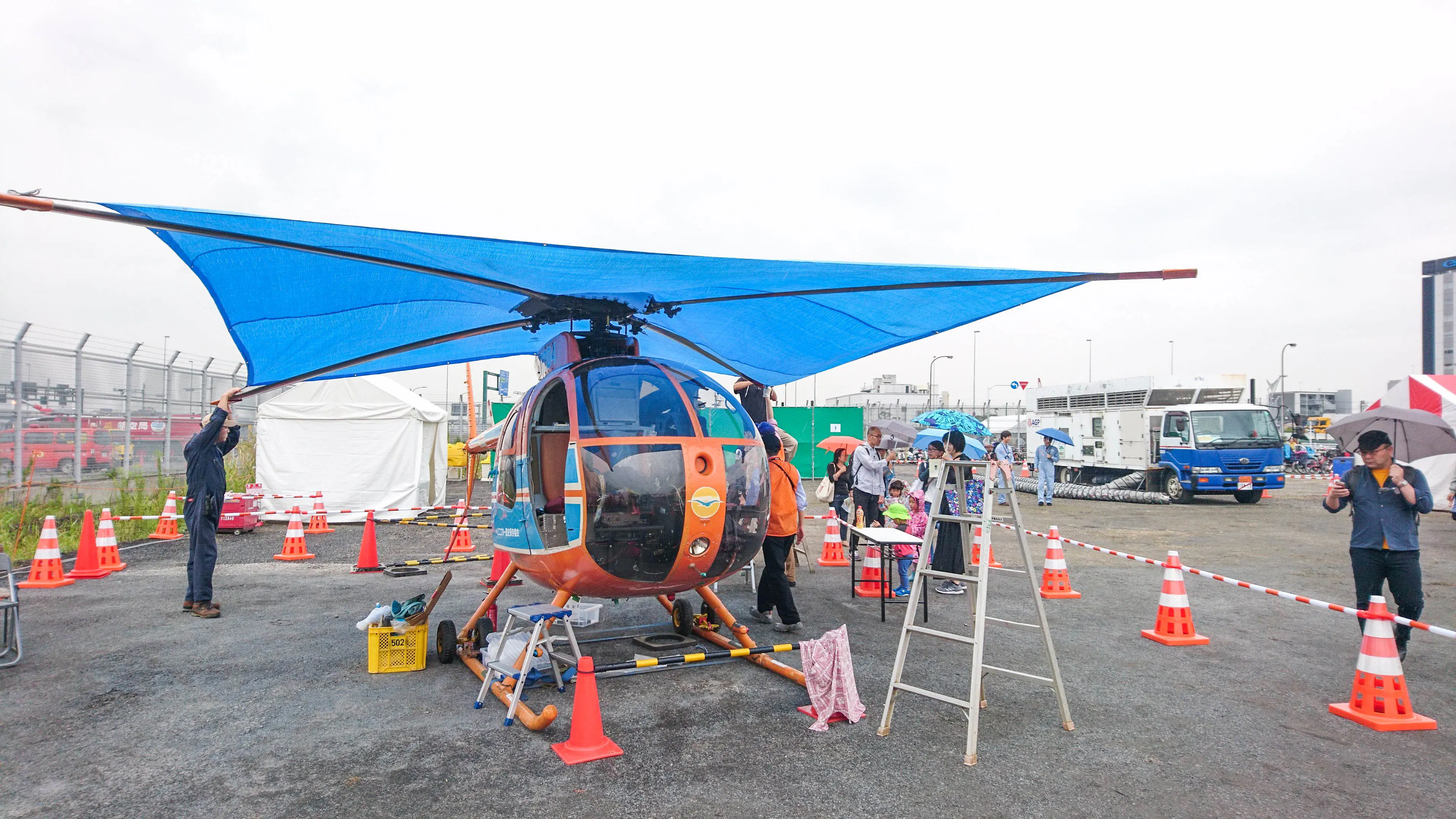 イベント前日、「ヘリ基地」から会場の羽田空港まで陸送されてきたヒューズ500。