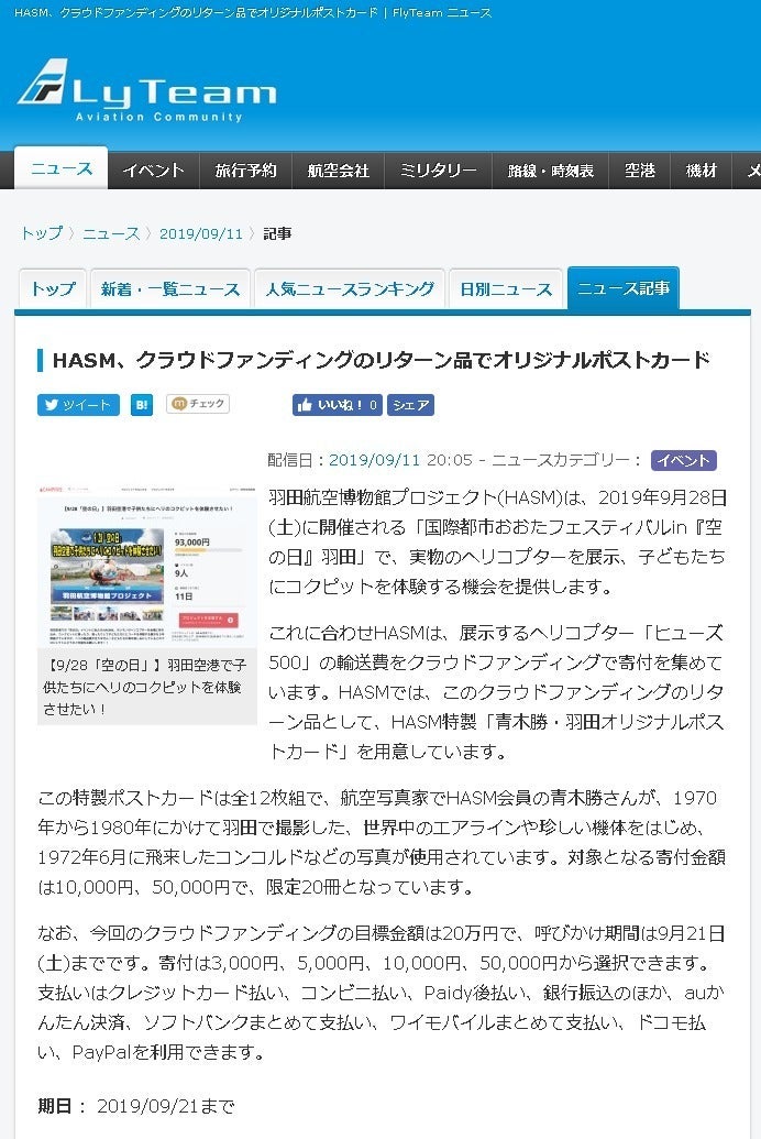 【9/28 空の日】羽田空港で子供たちにヘリコプターのコクピットを体験させたい!FlyTeamにプロジェクトの記事が掲載されました!!9月28日(土)国際都市おおたフェスティバルin「空の日」羽田にヘリを展示するため、私たちHASMがクラウドファンディングに挑戦していることを航空ネットサイトのFlyTeamが記事で紹介していただいております。https://flyteam.jp/news/article/114944締切の9月21日(土)まであと4日となりましたが、ご支援の額が目標の200,000円に対してあと74,000円足りません!!本当に一口で結構です。多くの方々からのご支援によって、このプロジェクトは達成できます。プロジェクトを成功させて、沢山の子供たちにヘリに乗って貰いたいのです。それを目指して、私たちも準備を頑張ってます。ぜひぜひ、ご支援のほどどうぞよろしくお願いします!!https://camp-fire.jp/projects/view/188817