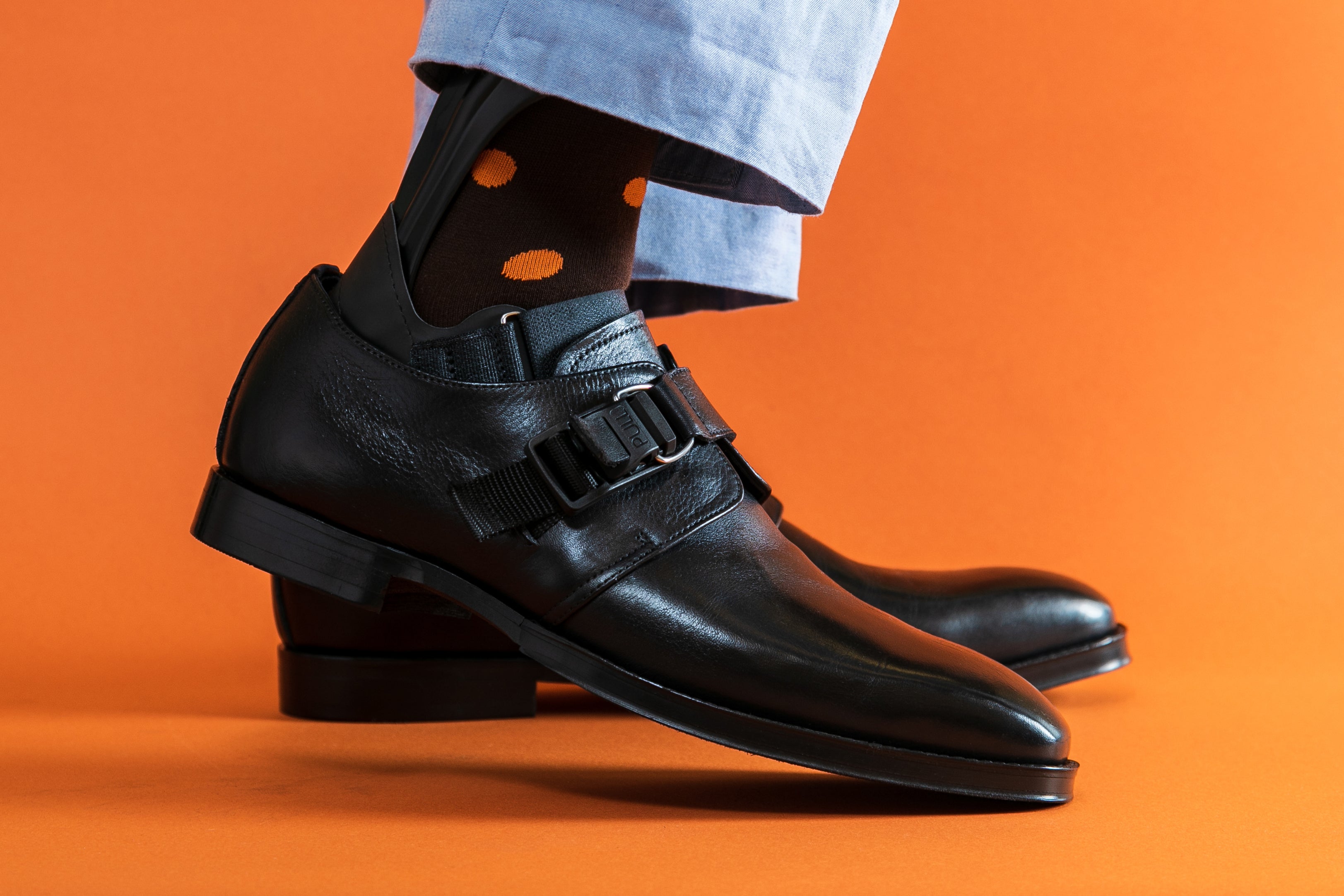 「高級感のある革のもつフォーマルな品格」と「マグネットバックルが高めたマジカルな機能性」がポイント。下肢装具をつけても着脱しやすく、さらに大切な商談や冠婚葬祭シーンであなたのそばによりそいます。はき心地をぜひお試しください。