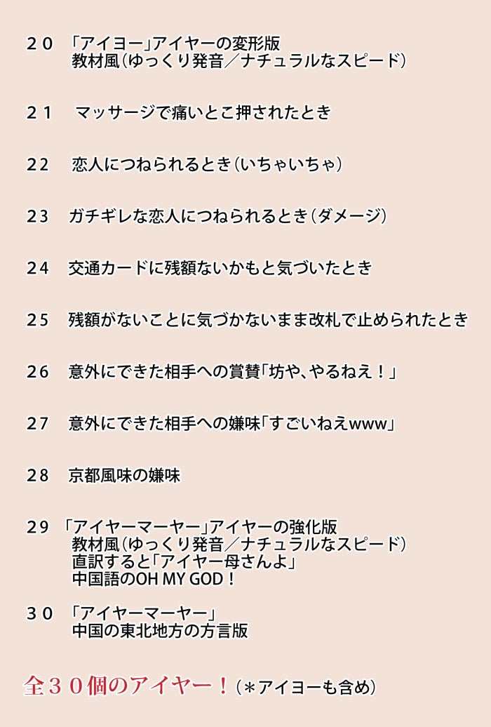 この30パターンの「アイヤー」を通勤退勤中に聞きまくれば、