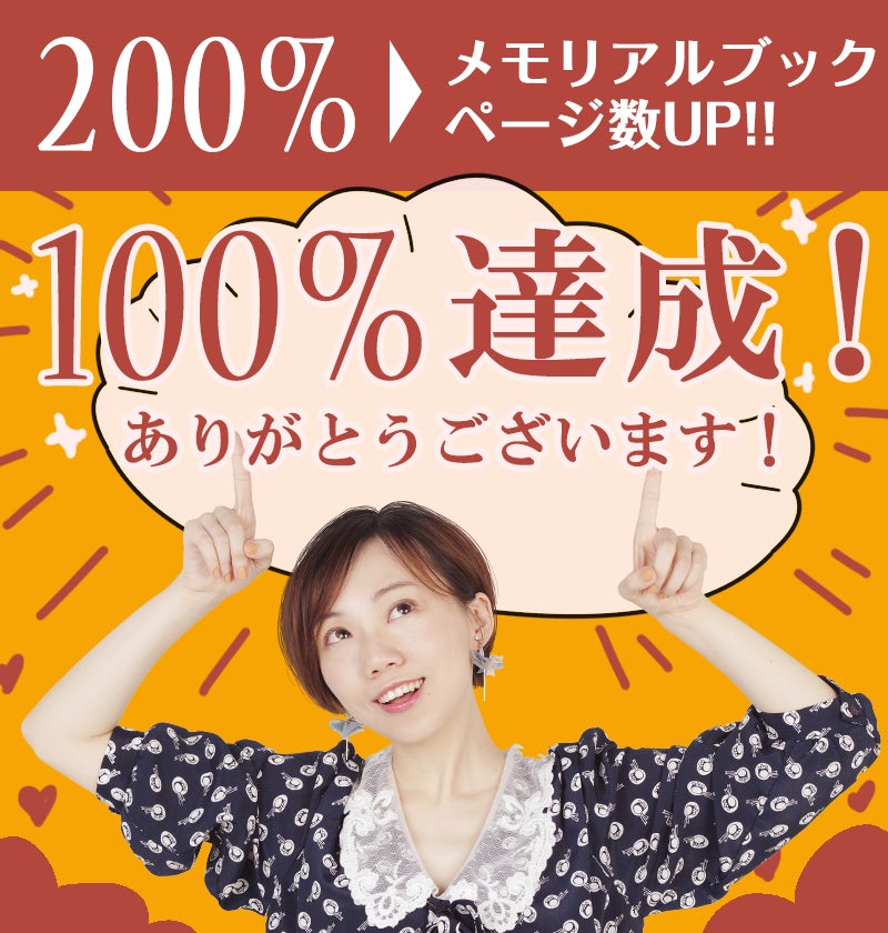 200% の「100万」に到達したら、フルカラーの「メモリアルブック」のページ数がUPします!