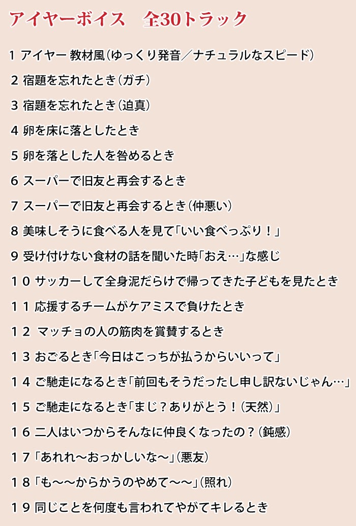 この30パターンの「アイヤー」を通勤退勤中に聞きまくれば、