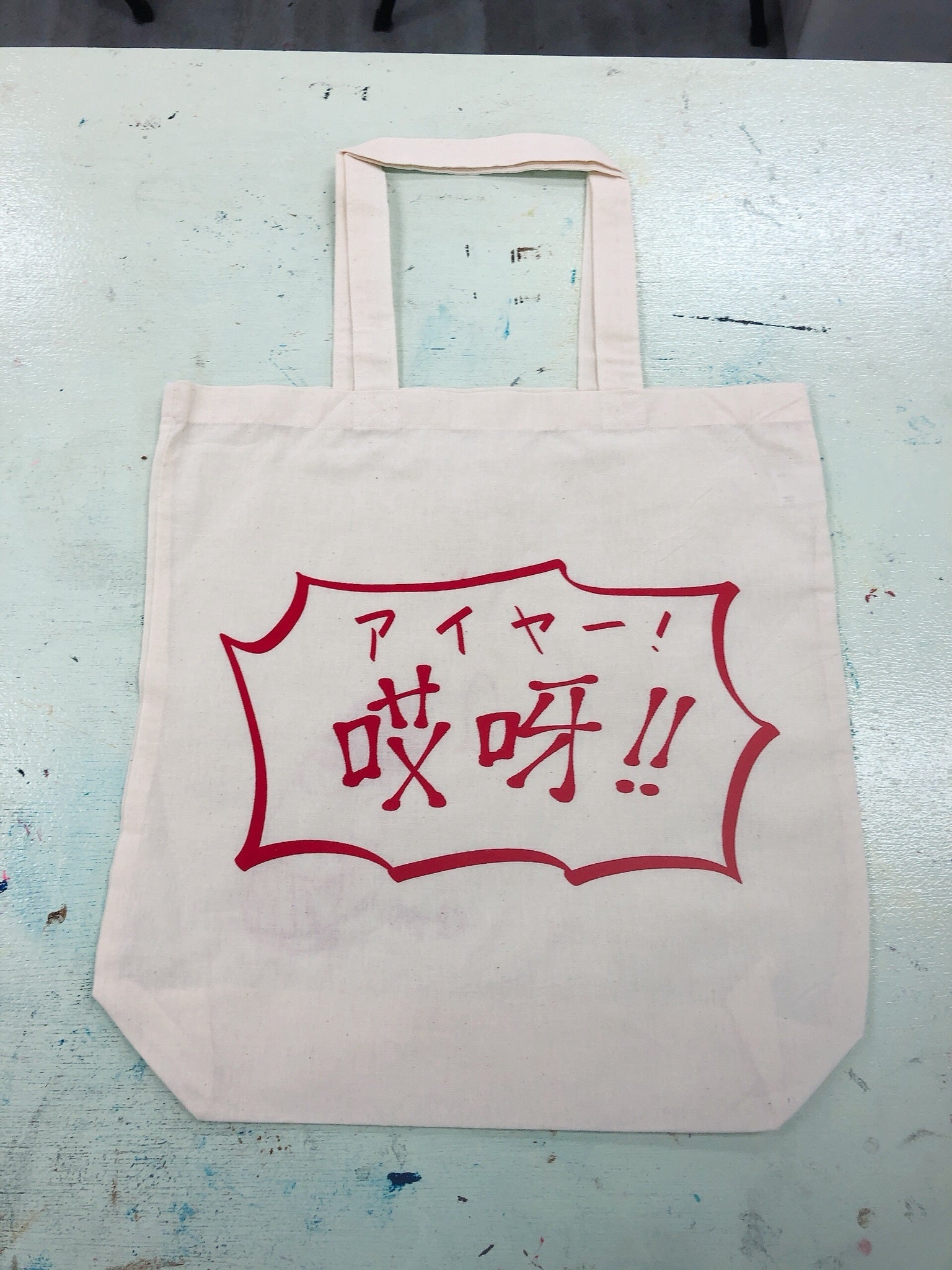 トートバッグと「アイヤー!謝謝!」缶バッジ 4個セットをつくりました!