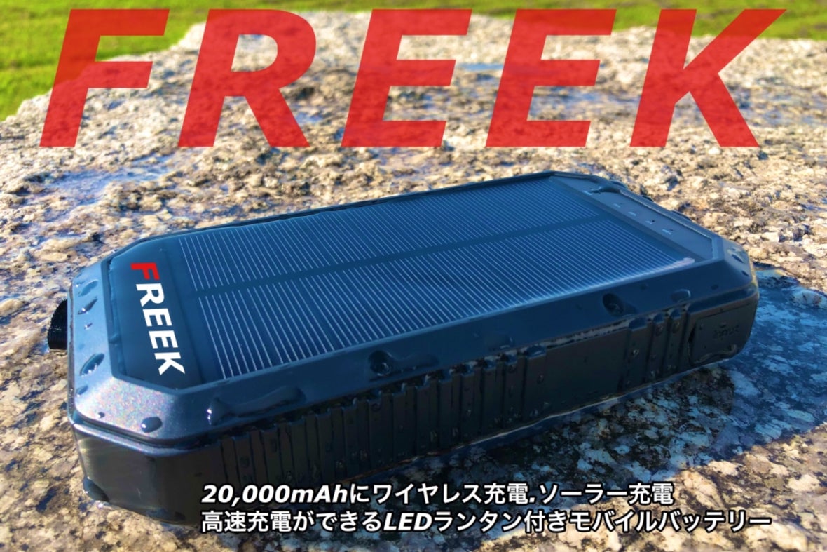 LEDランタン、大容量20,000mAh、Qi規格ワイヤレス充電、有線充電(3箇所)、高速充電(2箇所)、防水、耐衝撃、ソーラー充電、全ての機能を搭載した多機能オールインワン大容量パワーバンク「FREEK」
