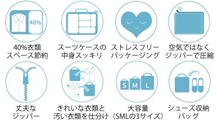 このように嵩張る衣類をしっかり圧縮してスーツケース内のスペースを最大40%節約します。