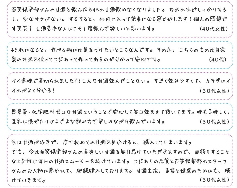福岡の歴史ある酒蔵様と一緒に作っているため、味に自信があるのはもちろん、「作りたての甘酒の味を多くの方に知ってもらいたい!」という百笑倶楽部の思いが詰まった商品になっていますので、共感していただけましたら支援していただけると嬉しいです。