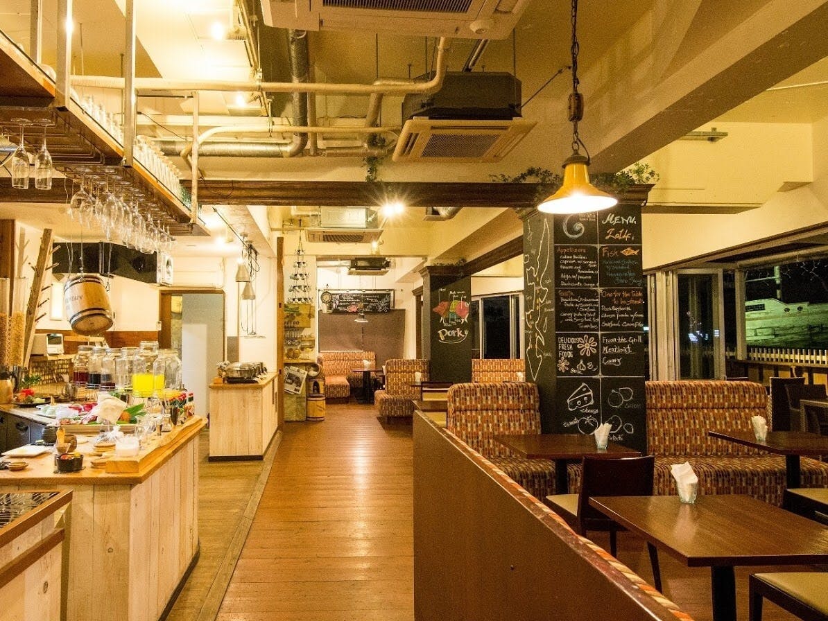 お店は沖縄県の北谷にあります。ピザ・パスタの食べ放題のレストランです