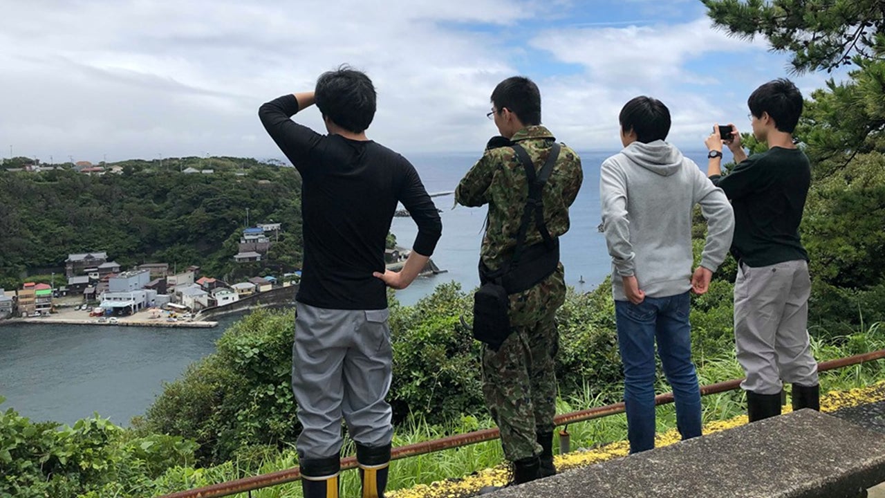 また事業活動の一環として、➡ゼロ高等学院の生徒たちを大島に受け入れ、「島体験留学」の実施を始めました。(ゼロ高生徒と、島の港を眺める。)