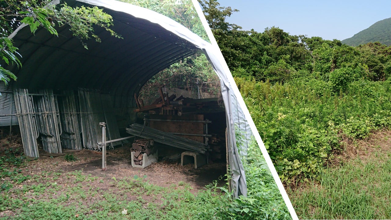 👉【実現したいこと③】🐎提携事業として複数人で営業を行い、「第二農場」を山の”ふもと”に作り、悪天候時の代替えサービスを提供可能にしたい!(「第二農場」建設予定地。この草木を刈れば、乗馬ができます。”ふもと”の「第二農場」も雨の時は、せめてこのような簡易厩舎で、”ふれあい体験”だけでもできれば……。)