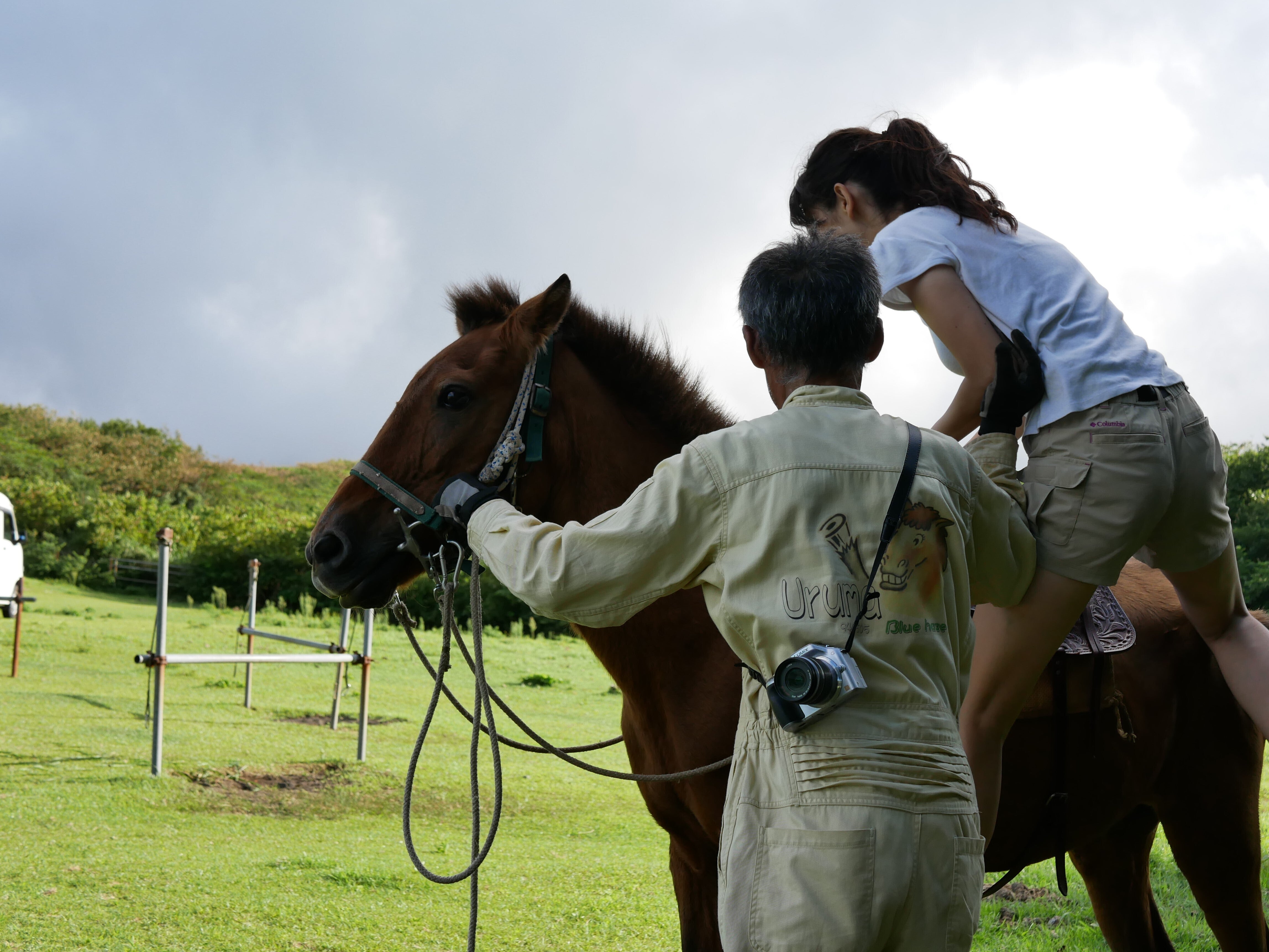 昼食を食べたら、山の上にあるブルーヘイズ農場で2時間のふれあい乗馬体験スタート!与那国馬はよく見る馬よりは小さいのですが、実際目の当たりにすると大きく感じます。