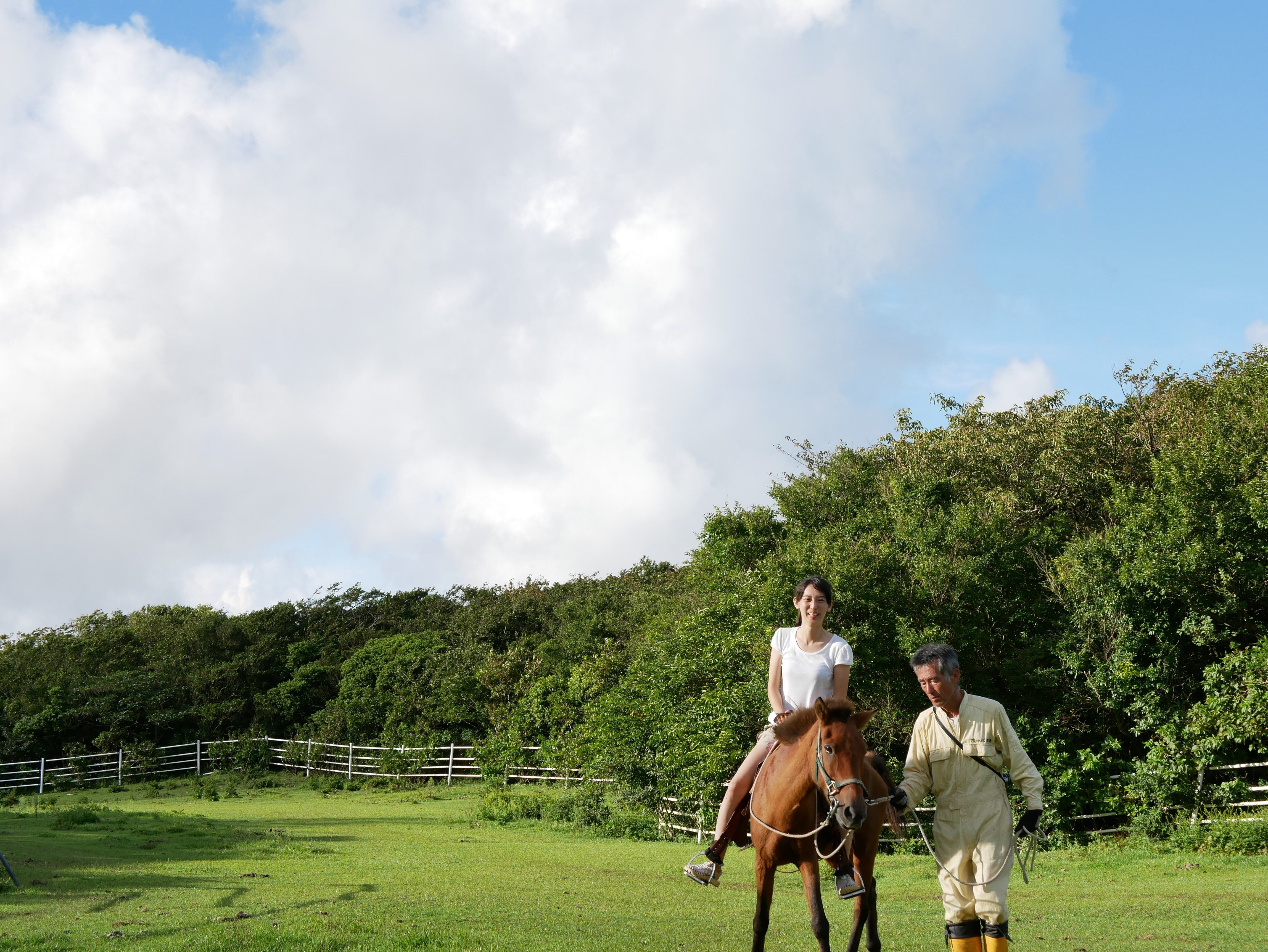 手綱を引いてもらいながら、牧場をぐるっと一周。不格好ながら、メイちゃんの揺れを楽しみました。