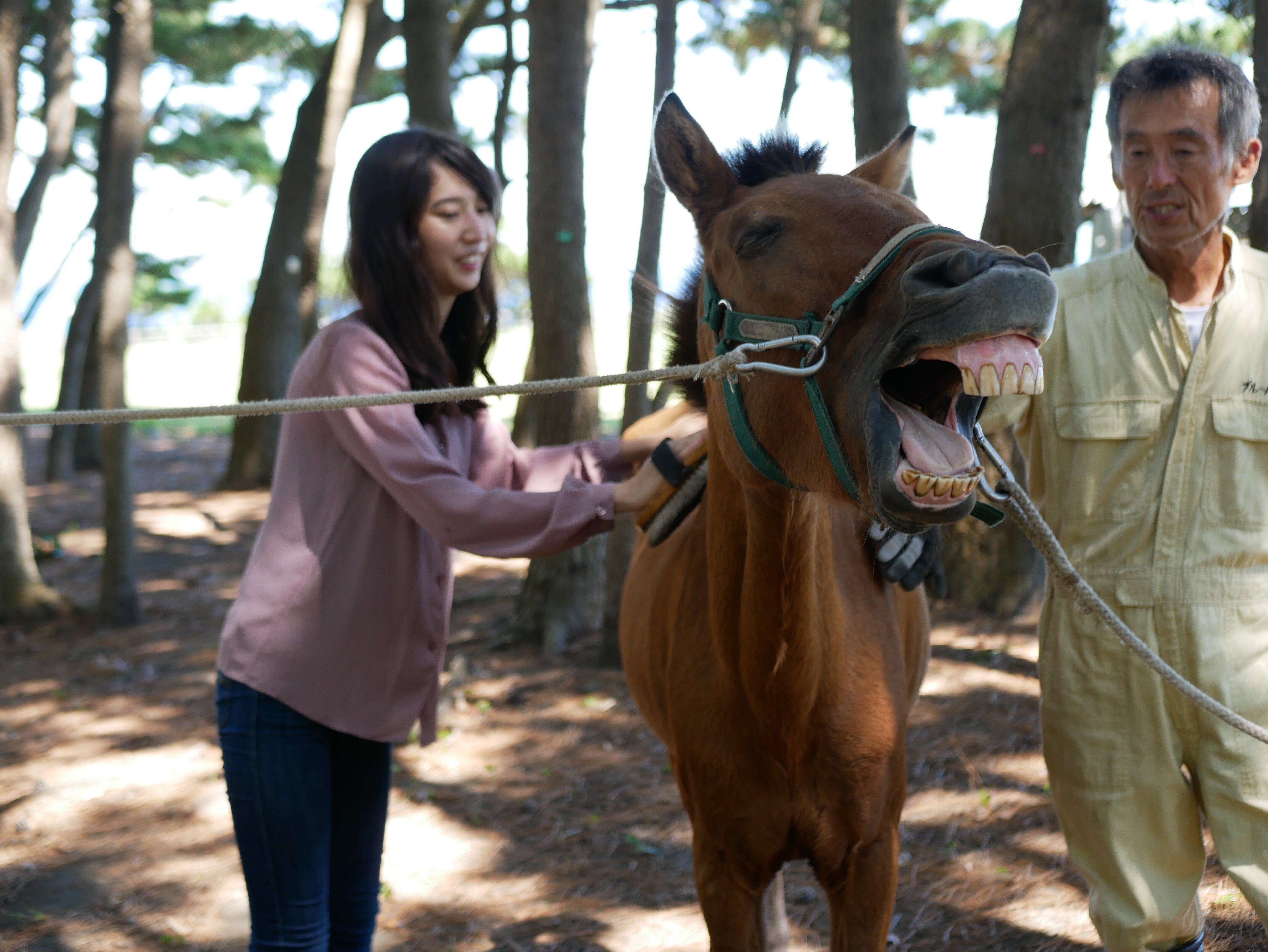 馬主の平山さんから「馬と仲良くなる方法」を教わりながら、餌やりとブラッシングを行います。大事なのがこのスキンシップという名のご挨拶。ゆっくり時間をかけて馬とコミュニケーションをとっていきます。