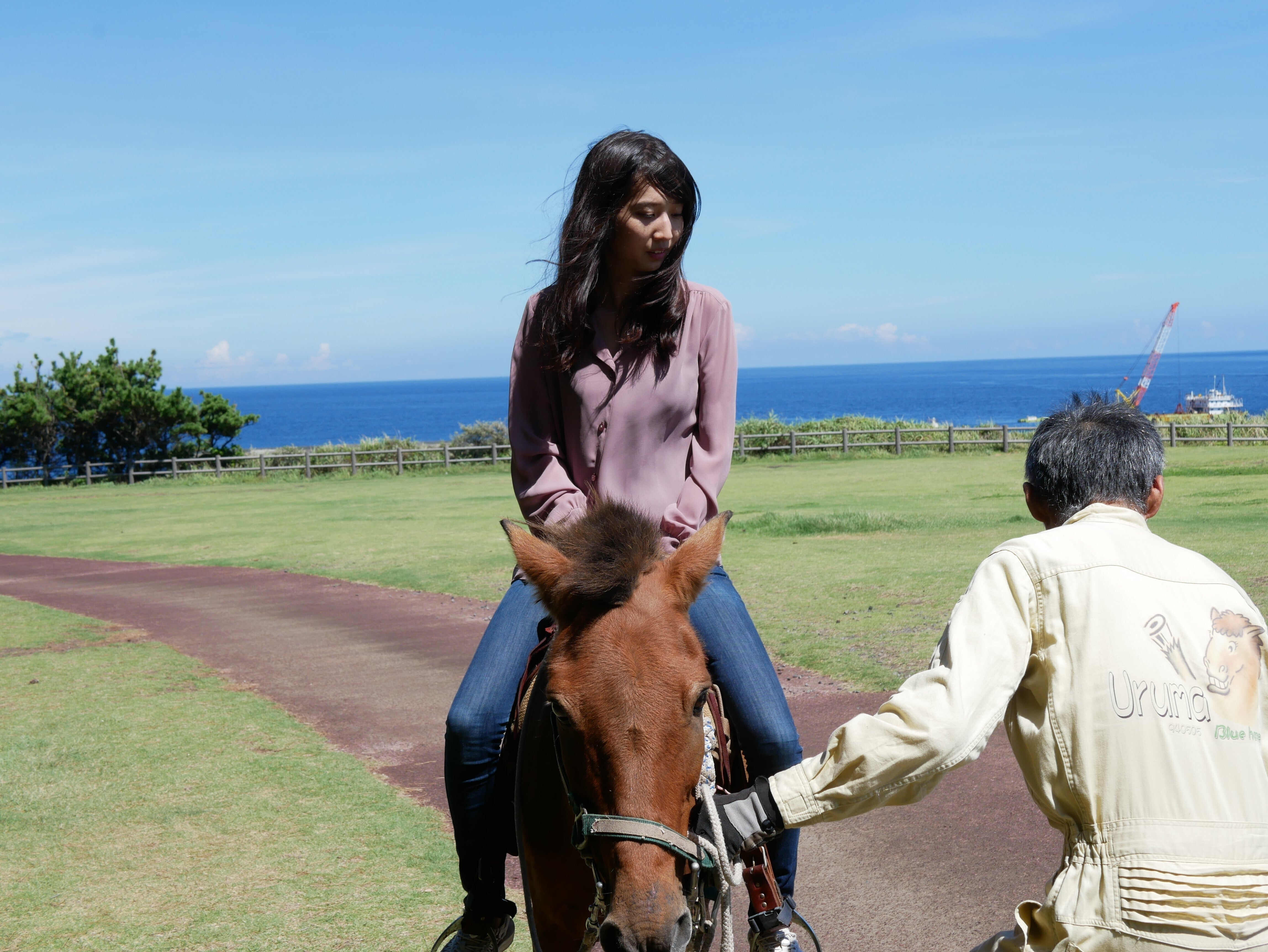 再びメイちゃんに乗せてもらって、海沿いの道をお散歩!一度馬にまたがると、視線が高くなって、より一層爽やかな島風を感じられます。