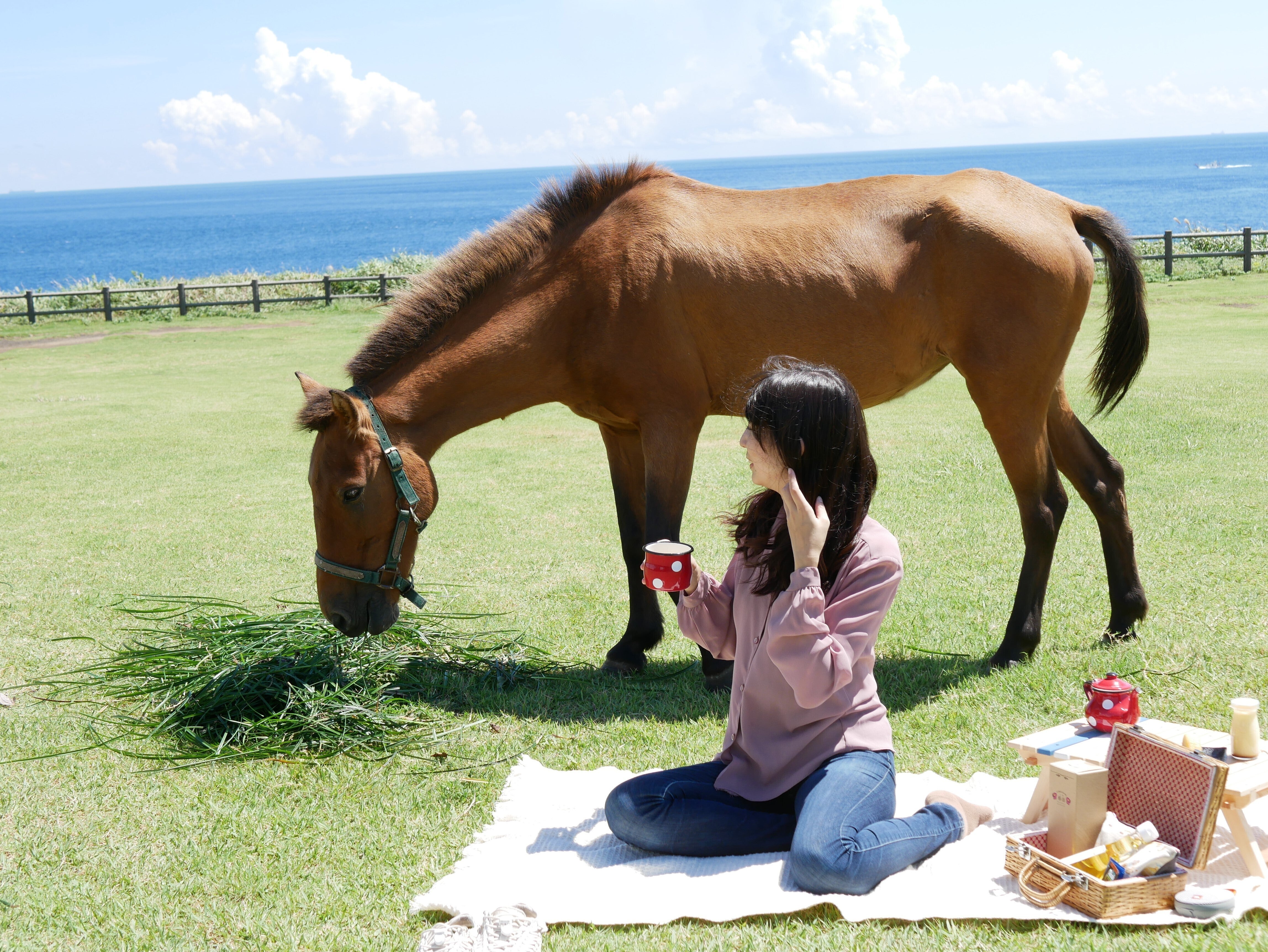 お昼は、メイちゃんと一緒にいただきました。飼葉を食べるメイちゃんと、大島牛乳プリンを食べる私。