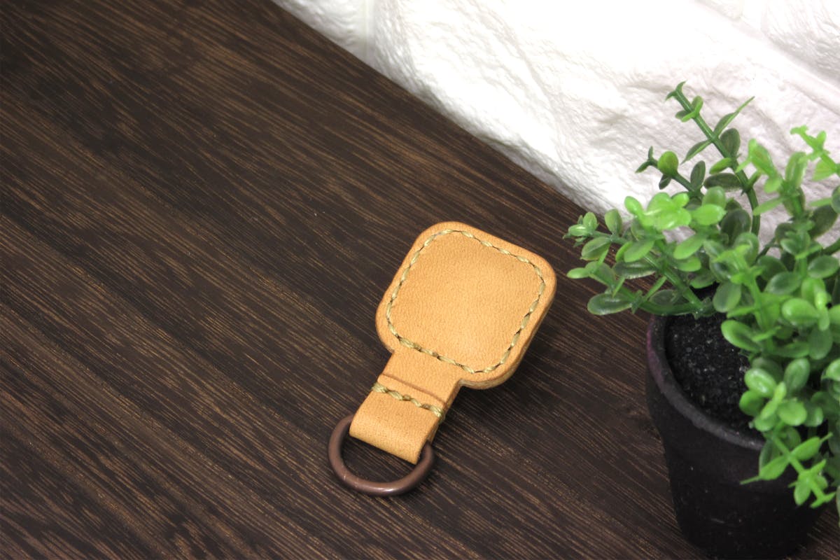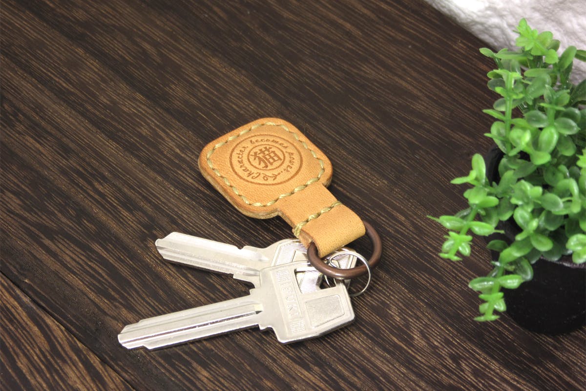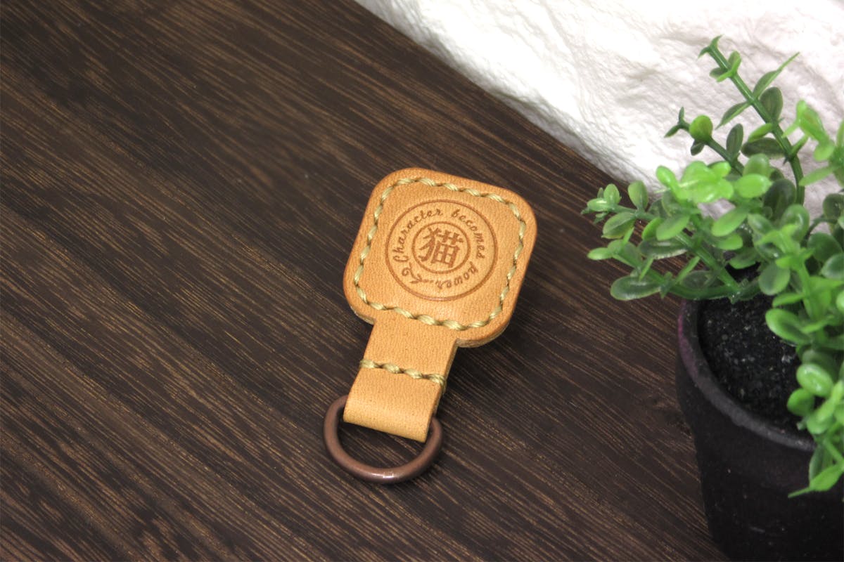 キーホルダーの漢字一文字を、あなた用に削り出し刻印します(画像では「猫」)。