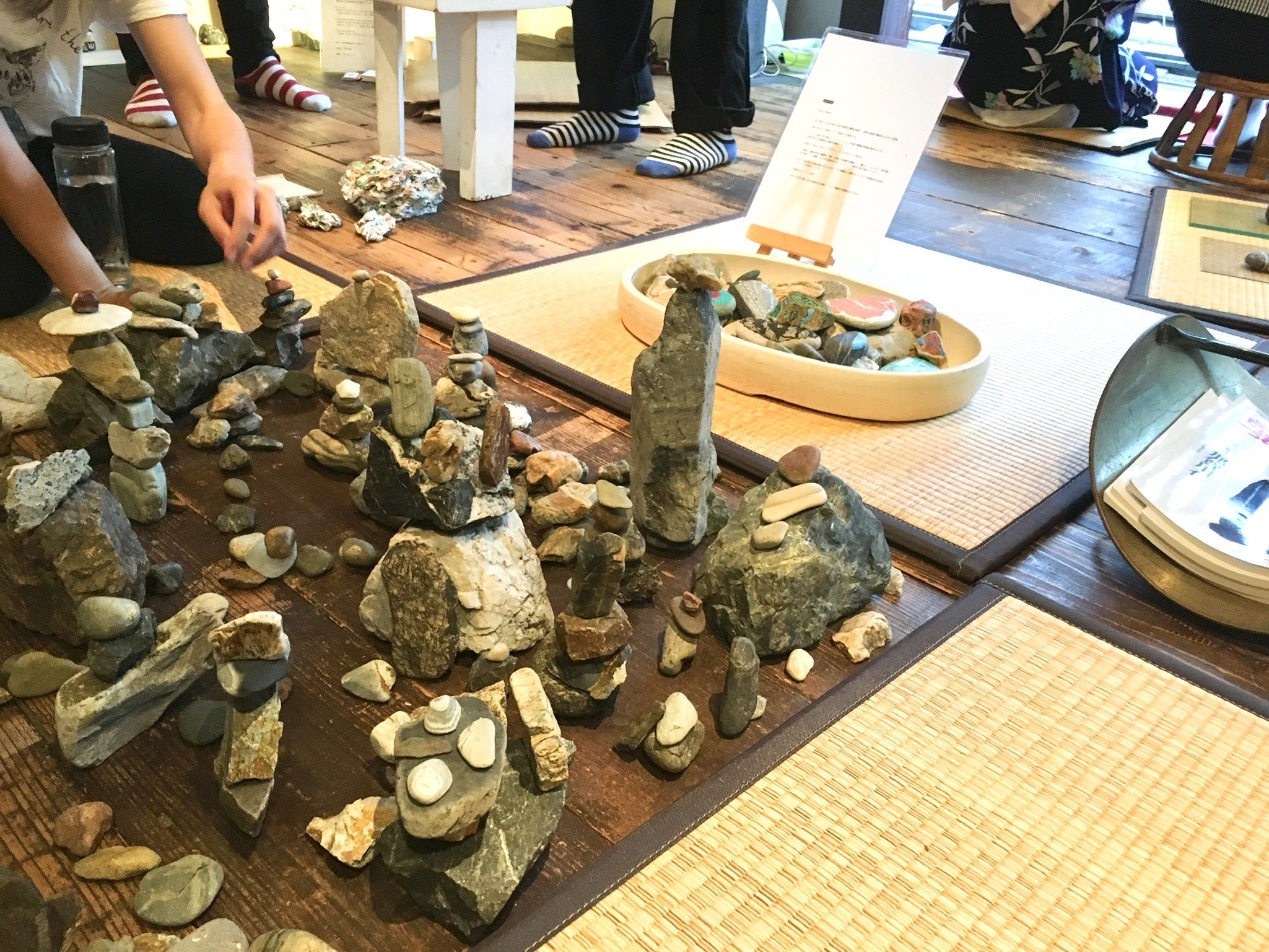 大阪という都市の中で誰もが時間におわれ沢山の情報に押しつぶされそうになりながら毎日を過ごしています。そんな中、都会のど真ん中で石をテーマにしたアートイベントを開催する事にとても意味があると思い毎年開催を続けています。会場の一つに毎年主宰の原が拾い集めた大量の石を置いています。目まぐるしい都市の中で石積みをして遊んだり、ぼんやり模様を眺めたり、そんな時間を過ごすことがより私たちの想像力を豊かにすると信じて開催を続けています。