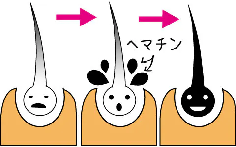 ヘマチンとは血液中のヘモグロビンを電気分解して、「ヘマチン」と「グロビン」に分けたものです。このヘマチンは毛髪成分のケラチンと結合しやすく、髪の成分を作り、若々しい髪を保ちます。