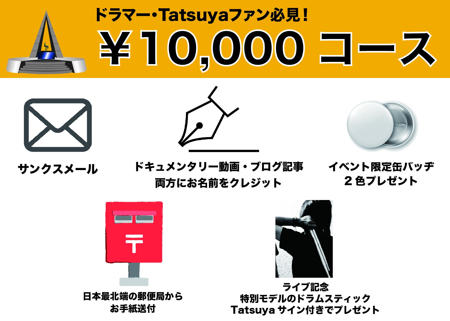 2019/09/20 21:53ラスト2時間ちょっと!!!改めてクラファン当初の意気込みを読むだけでも^ ^僕が産まれ育った町、北海道稚内市小学校6年生の時にクラスでアカペラが流行り音楽に触れ、中学校に進学し吹奏楽部に入部しドラムに出会い、高校でのめり込みました。そして、卒業後の進路を決める時にダメ元で父に専門学校に行きたいと言ったのですが、始めはダメだと言われ、仕事をしながらでも続けたいと思い色々仕事を探している中で、父が「やっぱり行きなさい」と言ってくれました。ここで送り出さなかったら、将来送り出さなかったことに後悔する。と本当に今でも感謝しています。そして担任にも専門に行くと告げたところ、国立大学に推薦も考えているから、進路を考え直せと話をしてくれましたが、親が押してくれたことで意思は固くなっていて、全部取っ払い、身一つで東京に来ました。東京に来て専門学校入学日まで不安がいっぱいだったのを今でも覚えてます人の多さ、水道水の臭いがなれなかったり、スーパーでの食料品の値段、電車一つ乗るのも一苦労でした。ですが入学してからはそんな不安を全部忘れるくらい刺激的な毎日でした!学校の先生達の演奏、稚内では考えられなかった同年代でのバンドマンの多さや技術、初めてのライヴハウス、高校時代に憧れていた人との出会い。そして卒業卒業したからといって、なにか就職先があるわけでも、保証があるわけでもありません。卒業後は半年程個人練習以外でドラムに触れられる機会もありませんでした。せっかく東京に来て、専門学校まで通わせてもらったのになにをやっているんだと自暴自棄になることもありました。そんな時に出会い声を掛けてくださったのが、今回稚内で一緒にLIVEをする海老澤さんでした!出会いはSNSだったのですが、メッセージをやりとりする中で講師に興味があれば一度お話しどうでしょうか?と、お話しを頂きました。そのメールを頂いた時は本当に嬉しくて嬉しくて。今でも感謝の気持ちでいっぱいです!そんな海老澤さんと稚内でLIVEがやれることを本当に楽しみにしています!!そして、ライヴをやるにあたりオファーしたボーカルのTAKUROCKさんベースの稲葉浩太さんお二人ともオファーした際に、ギャラや旅費のことを聞くよりも先にOKを頂きました。みなさん!本当にありがとうございます!!そこで、せめて渡航費と宿泊費だけでも僕からと思い今回のクラウドファンディングとなりました。今回のライヴは本当にただの僕のわがままです!上京した当初から少しでも上手くなって知名度を上げて、東京のミュージシャン達と稚内でライヴする!!そう思いながら稚内を後にしました。ずっとずっとずっと思い描いていたものの中々実行出来ずにいました。でもこうしてみなさんの協力があり本当にもう少しで実現するところまで来ています!!観てもらいたい人はいっぱいいます!当時の友達やバンド仲間、バンドの先輩達、帰省するといつも東京であったことの報告を聞いてくれる方もいます。そして、なにより東京に行くことに背中を押してくれた父にその姿を見せられるの嬉しいです!!!是非色々な人と出会い、刺激を受けた石川達也を見せられたらと思います。 もっと見る間も無く