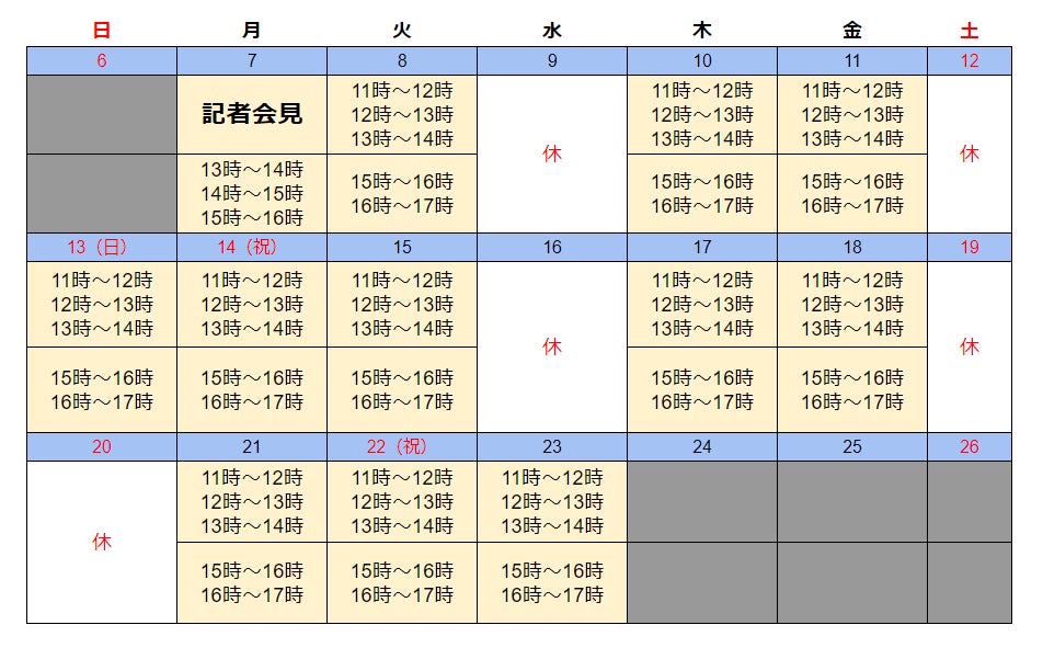 以下の表がカフェの営業時間です。各1時間の枠を指定して、チケットをご予約ください。