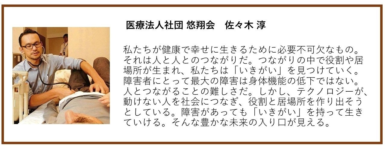 そして来年2020年には多くの海外の方も日本に来られますが、私たちの国は「たとえ身体が動けなくなったとしても心を元気に保ち、仲間達と楽しく過ごせる国」と、多くの諸国に日本人らしい生き方を感じていただき、「機械とつながって生かされる」ではなく「生きる為のテクノロジー」を発信できる場を皆さまと一緒に目指していきたいと思っています。