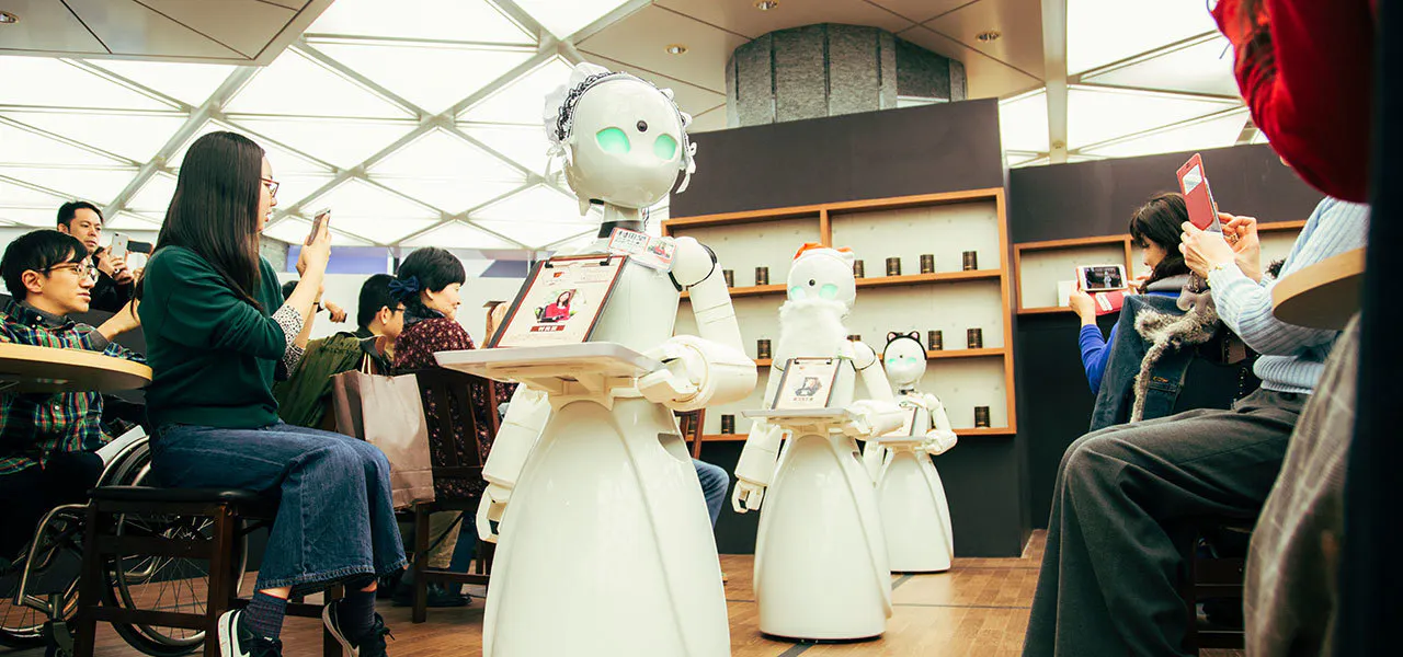 病気、入院、様々な理由で外出する事が困難な方々が、自宅や病院にいながら自分の分身となるロボット「OriHime」を遠隔操作し、接客を行う実験カフェです。