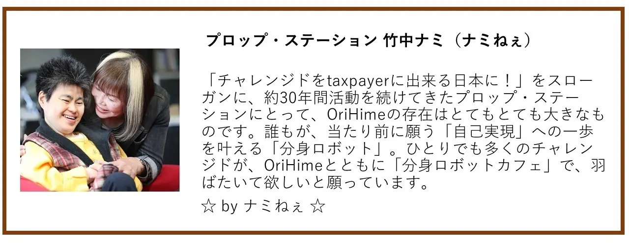「様々な理由で外出困難な仲間達と一緒に働けるカフェを作ろう」と言っていた親友はそのOriHime-Dの完成を見る事なく、28歳で旅立ってしまいましたが、私たちの理念に賛同していただいた日本財団さん、ANAホールディングスさん、そしてクラウドファンディングで支援してくださった230名の支援者の方々と共に、私と番田の念願ともいえる第一回「分身ロボットカフェ」実験を行うことが出来ました。