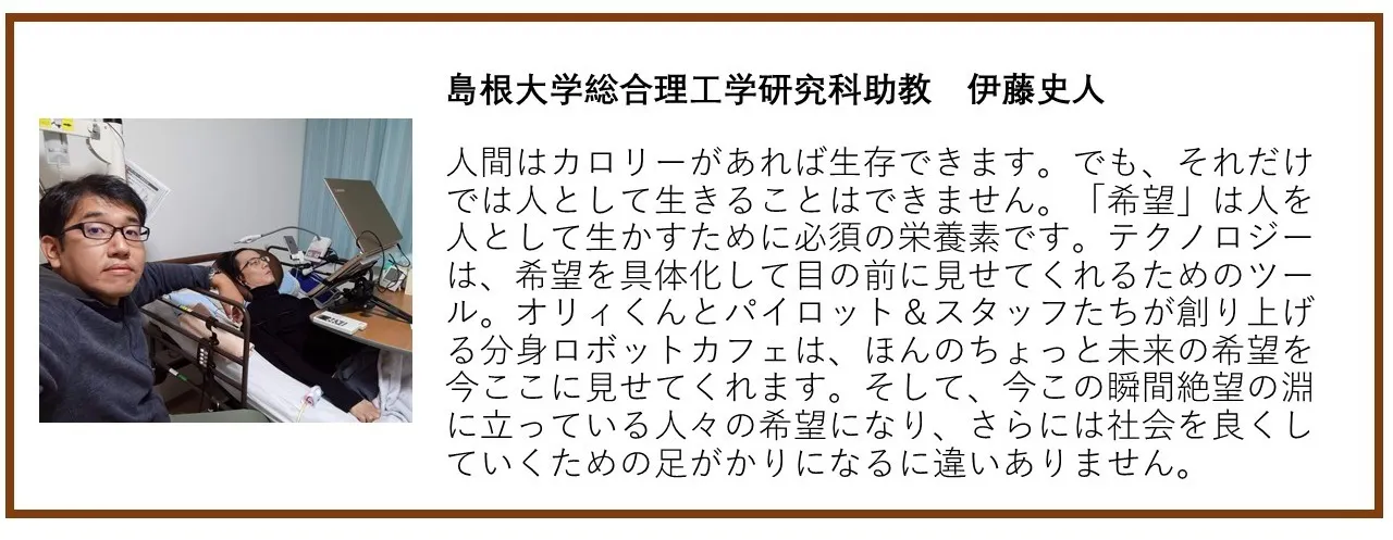 病気や障害で身体を動かせないと、学校にも行けず、仕事場にも行けず、友達と遊びにいって思い出を作る事も困難です。ベッドで毎日天井を眺め続けるのではなく、会いたい人に会えて、行きたい所へ行ける心の車椅子、それがOriHimeというロボットの原点です。
