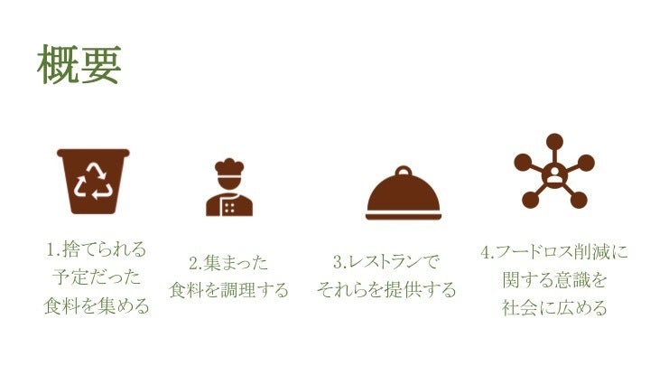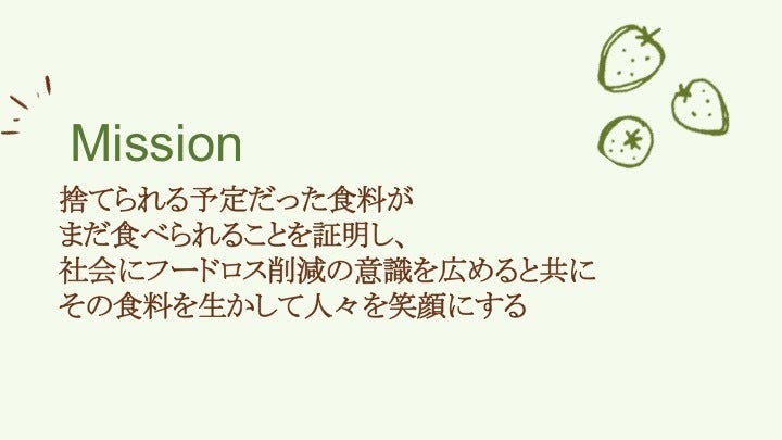 また、日本では7人に1人が相対的貧困と言われています。食が余っているのに栄養がある食事を十分に取れない人がいるという矛盾が起きています。最終的にはこの問題にも取り組めるよう、常にお店をアップデートしていく予定です。