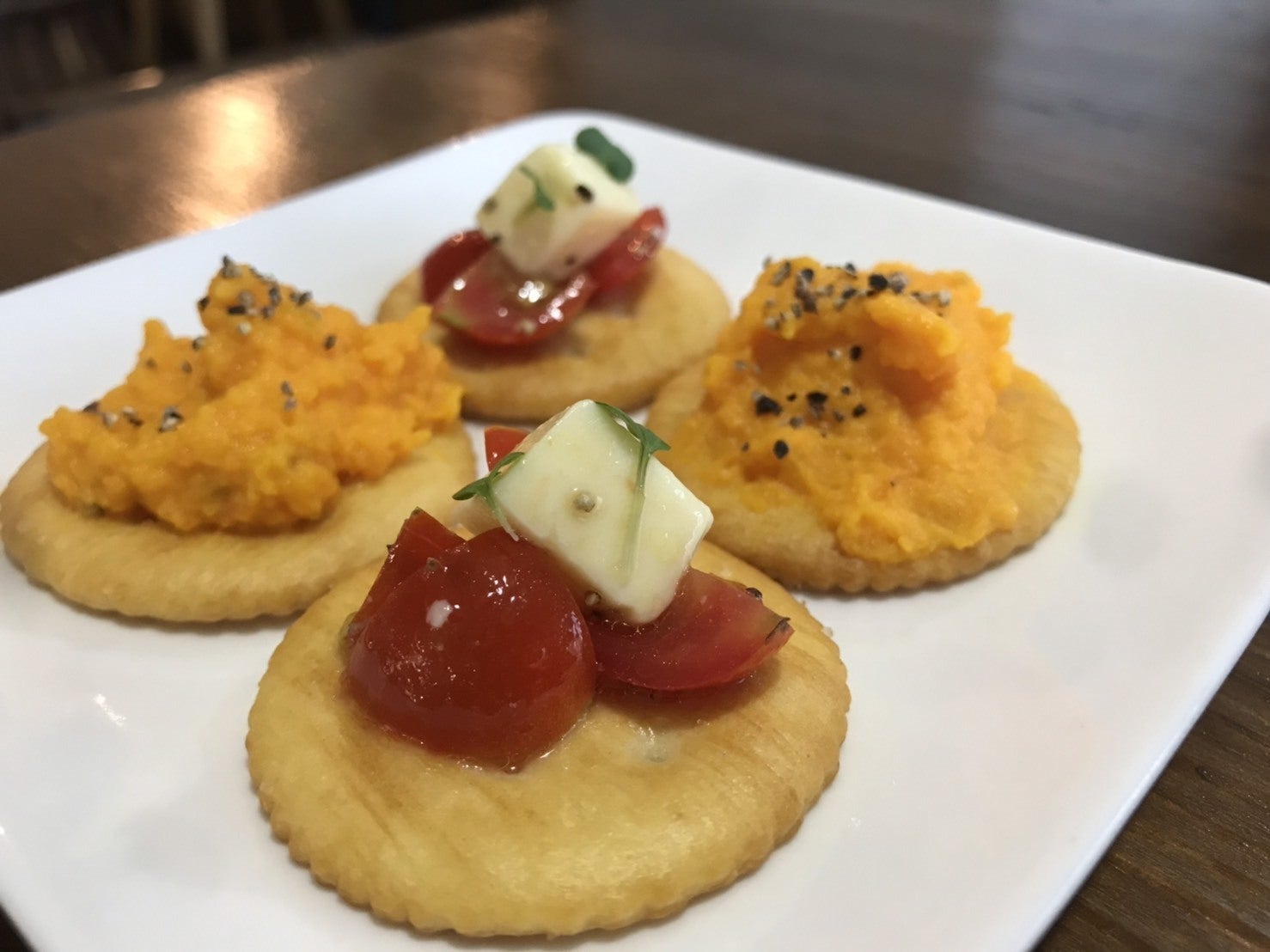 トマト×チーズ、にんじんピューレのカナッペ