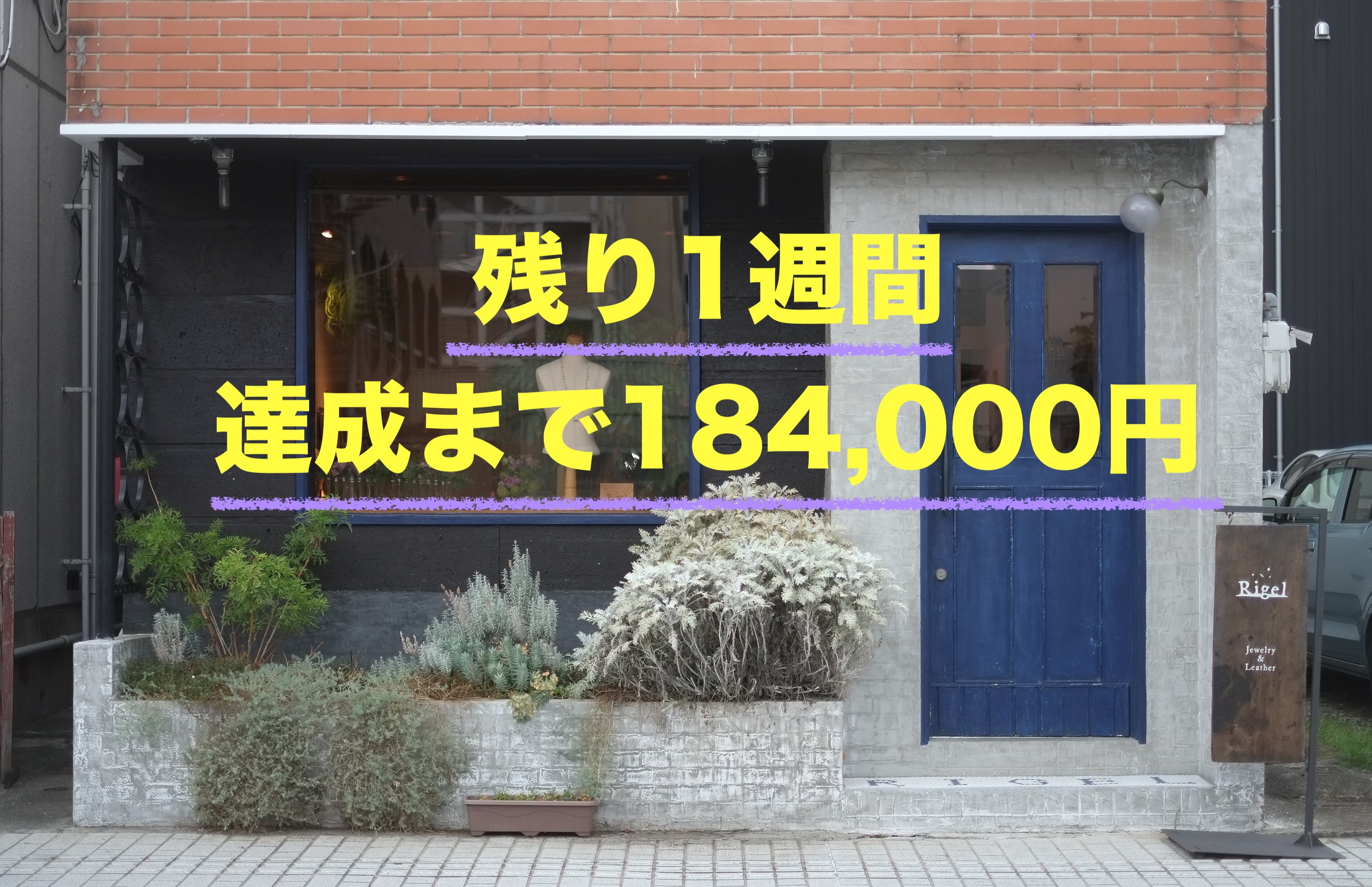 〆切まであと6日、達成まで165,000円となりました。〆切間際ではありますが、新たなリターンを追加しました。Rigelをギャラリーとして使っていただけます。作品の種類は問いませんが商品ディスプレイに干渉しない範囲となりますので、写真やイラストなどが向いていると思います。詳細はこちらです↓↓↓-------------------------------------------------◉Rigelをギャラリーとして使用する 1口5,000円/30口限定【リターン】・Rigelの壁や家具を使って写真展やイラスト展をおこなう・5,000円につき1日となります(2日間以上開催したい場合は2口以上のご支援をお願いします)・使用期限 2019年12月〜2021年7月末日【詳細】・原則としてRigelの営業日・時間内での開催となります・原則として商品のディスプレイに干渉しない範囲での展示をお願いします・開催にあたってはRigelのSNSにて告知のご協力をいたします・作家本人の在廊は任意です・展示だけでなく作品の販売も可能です(条件は要相談)・公序良俗に反する作品や、いちじるしく品位を欠くもの、Rigelの理念に反する作品はお断りする場合があります・お申し込みの際は、展示したい作品の内容や時期などを備考欄に記載していただけますと幸いです