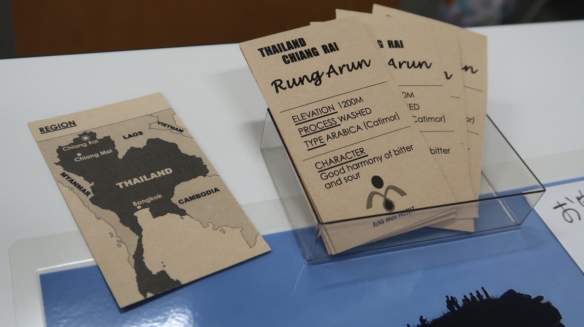 コーヒー農園の標高や精製方法、品種、そして味の特徴などを記した名刺サイズの販促物
