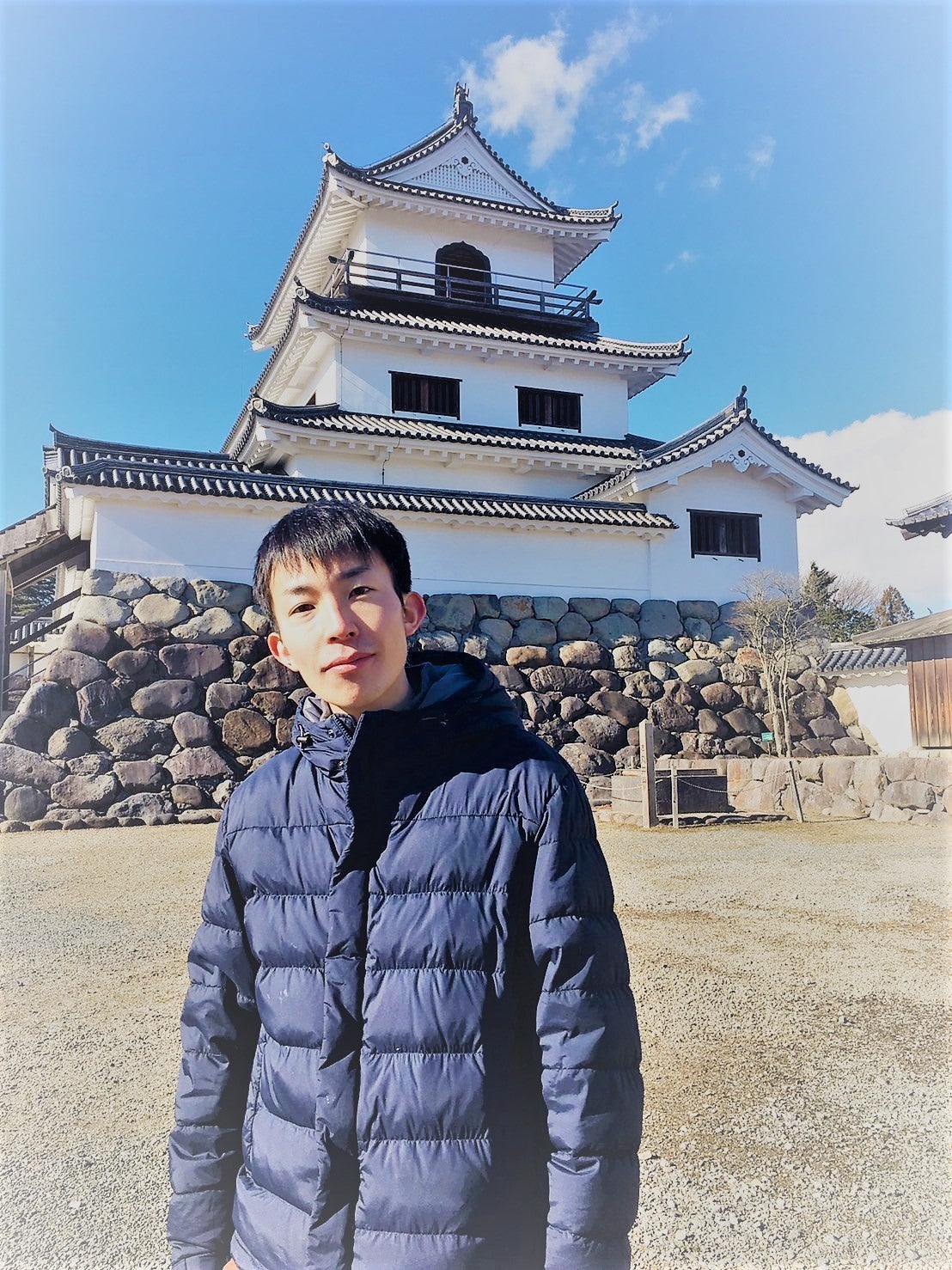 私は朝倉寿雄と申します。(背景は白石城です。)